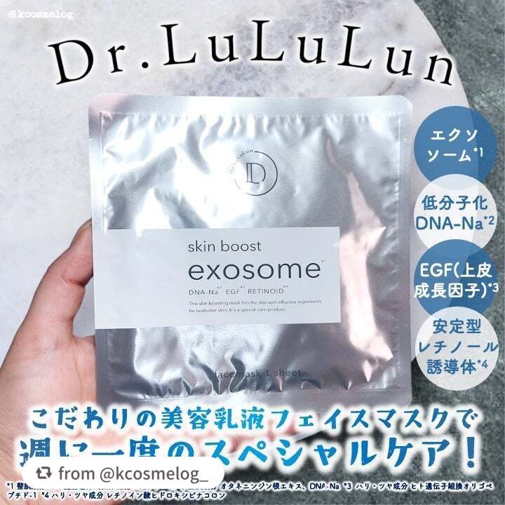 - ルルルン公式オンラインストアにて数量限定発売 幹細胞美容の先端科学をもとに、次世代スペシャルケア成分を贅沢に配合した、高濃度美容乳液マスク。 ヒト脂肪由来間葉系細胞エクソソーム*1、DNA-Na*2、EGF*3、グルタチオン*4、安定型レチノール誘導体*5などの美容成分をたっぷりと配合し、くすみ※1やしぼみ感が気になる大人肌のキメを整え、はずむようなハリとつやめきのある、いきいきとした肌印象を叶えます。 これまでのルルルンとはちょっと違う、攻めのスペシャルエイジングケア※2マスクです。 (※1 乾燥による ※2 年齢に応じたケアのこと *1 整肌成分 *2 整肌成分 オタネニンジン根エキス、DNA-Na *3 ハリ・ツヤ成分 ヒト遺伝子組換オリゴペプチド-1 *4 整肌成分 *5 ハリ・ツヤ成分 レチノイン酸ヒドロキシピナコロン)