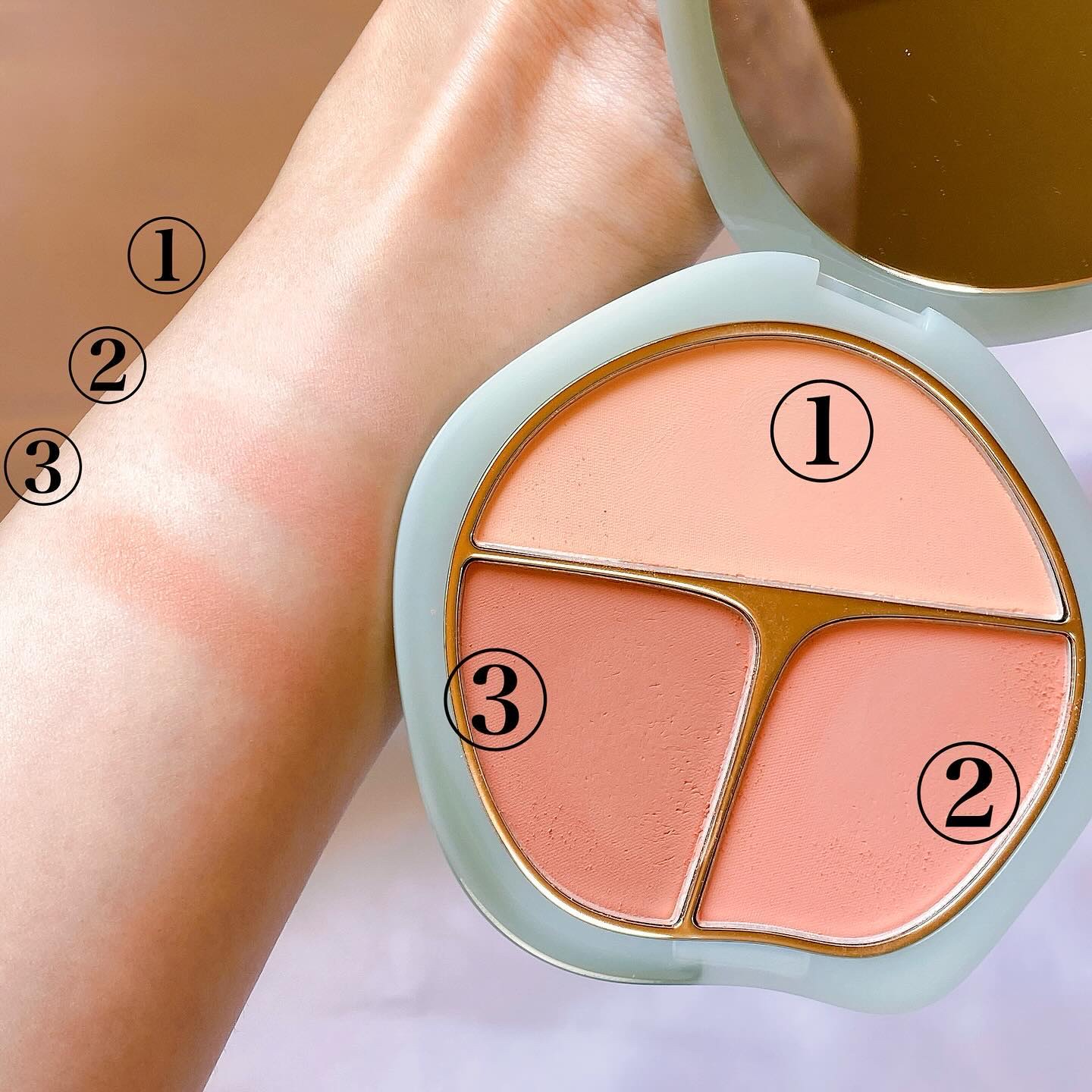 - 「膨張色+メインカラー+収縮色」の三色一体型チークパレット。 異なる明度と彩度の色で自然なグラデーションと立体感を作ることが可能。単色で使用すれば様々な雰囲気のメイクが楽しめ、違う色を重ねて使用すると、三色が程よいバランスで雰囲気と立体感を作り出す。