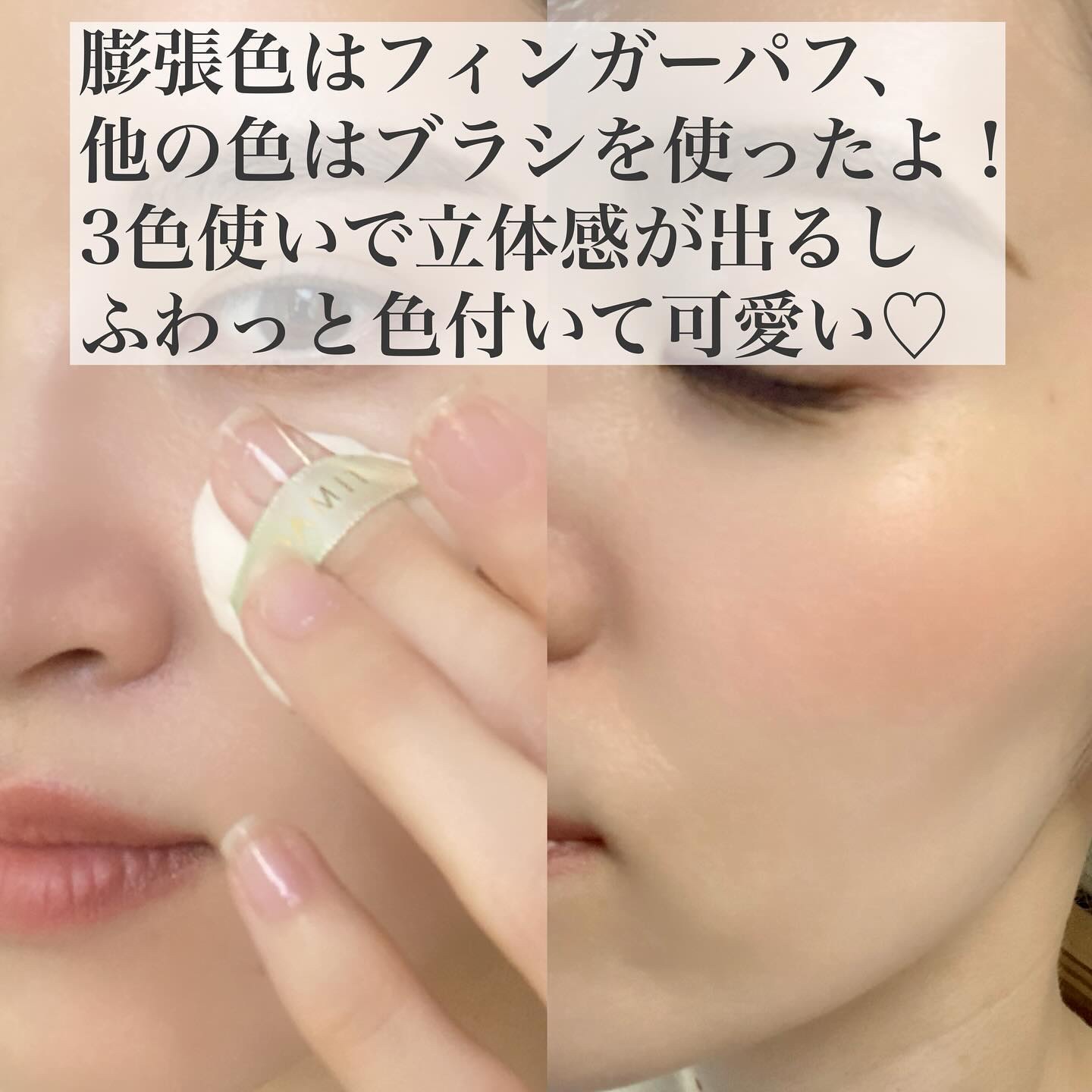本当に使えるアイテムだった😍✨ 今回使ったのは、02のピンク系カラー ブルベでもイエベでも使いやすいカラーだよ このチークパレット、すごいのが3色の使い分け 簡単なのに、メイクの質が全然違うの! パッケージは高級感があって気分も上がる✨ 付属のフィンガーパフもころんとした見た目で、使うのが楽しくなっちゃう🥰