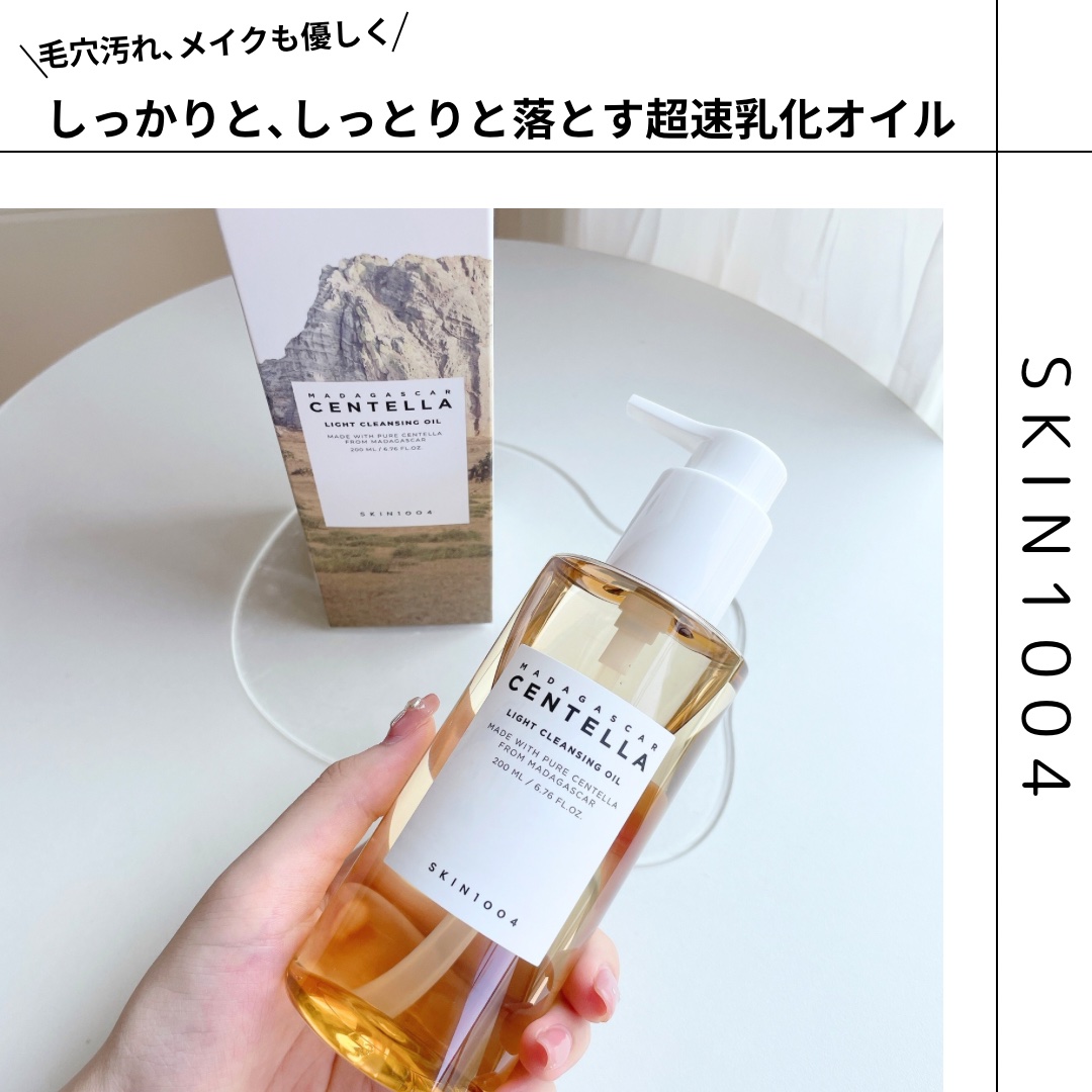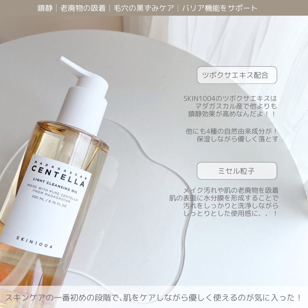 マダガスカル産CICA配合のセンテラアンプル❤︎ センテラアンプルと同じ、SKIN1004こだわりのシカ成分 が揺らぎがちな肌をやさしく鎮静*2 し肌のバリア機能をサポートして健やかな肌にしてくれる、クレンジングオイルだよ〜! 水となじむ親水性の部分が肌の表面に水分膜を形成。汚れをしっかりと洗浄しつつ、しっとりとした洗い上がりを叶えるよ✨✨ 洗い上がりの突っ張った感じが気にならなくてびっくり! アイライナーなどの濃いメイクは少し落ちにくかったので、ダブル洗顔は必要かも。