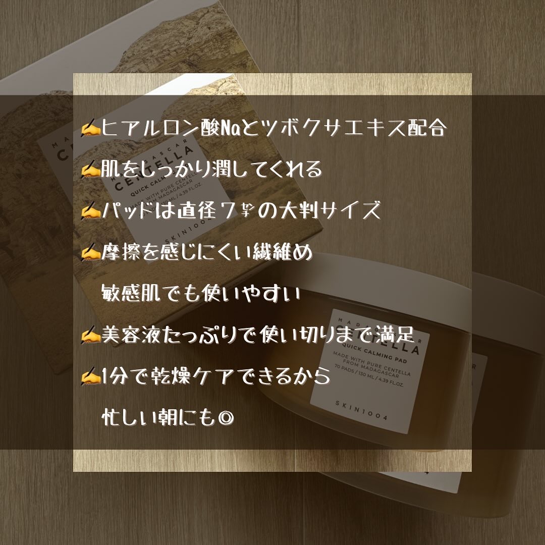 全成分EWGグリーン等級の鎮静パッドと なっていて時間がない朝でもたった1分で叶える水分チャージしてくれるらしい! 特にいいなぁーと思ったところは化粧をする前に使えるのが嬉しいなと感じたこと。 顔の窪んでるところでも密着して使えるというのもよかったです。