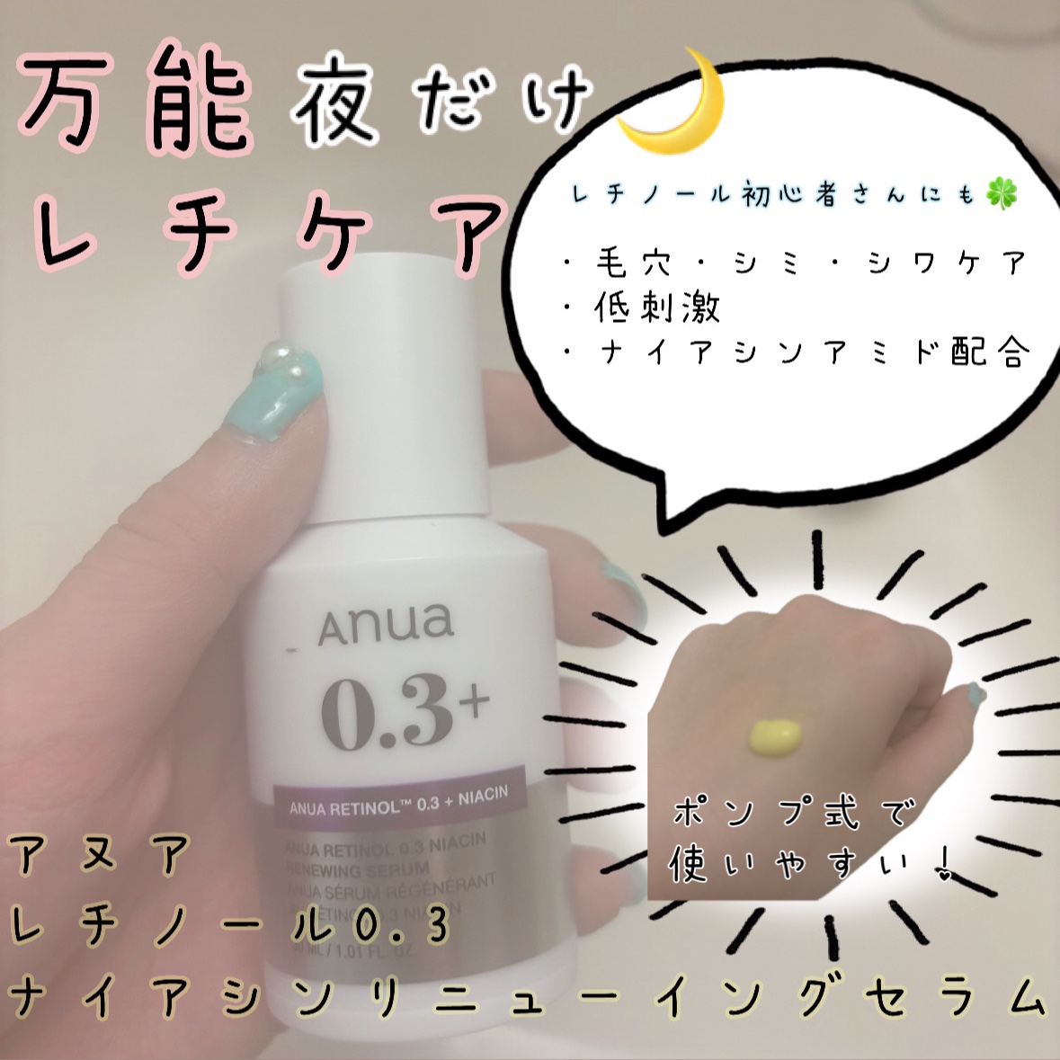レチノールで有名なAnuaの美容液です! レチノールといえばA反応が出る人もいるなど攻めのスキンケアとして有名ですが、このAnuaのレチノールは刺激が少なく肌が弱い方でも使いやすいです👍 ナイアシンアミドも配合されているので美白ケアも同時にできるのもおすすめポイントです! しばらく使っていますが、肌がツルピカになってきた気がします✨ レチノール初心者の方はぜひ試してみてください!