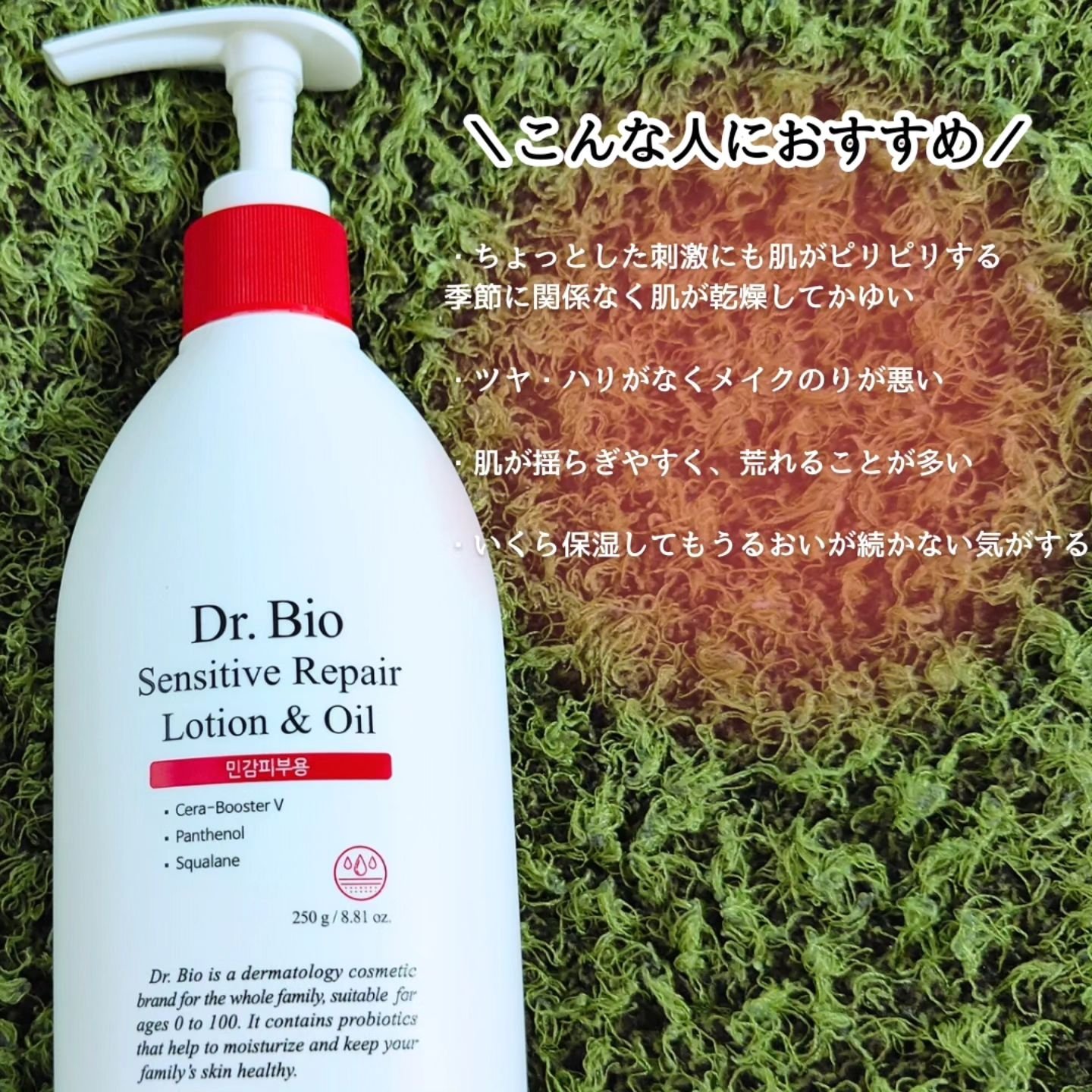 敏感肌でも安心して使える オイルインボディローションです 高保湿ですがべたつかずなめらかでスル〜っと伸びや肌なじみ良くしっとり優しいつけ心地です 特許取得の自然由来CICA乳酸菌 (シカラクトバチルス発酵溶出物) パンテノールやヒアルロン酸が敏感になった肌をケアします