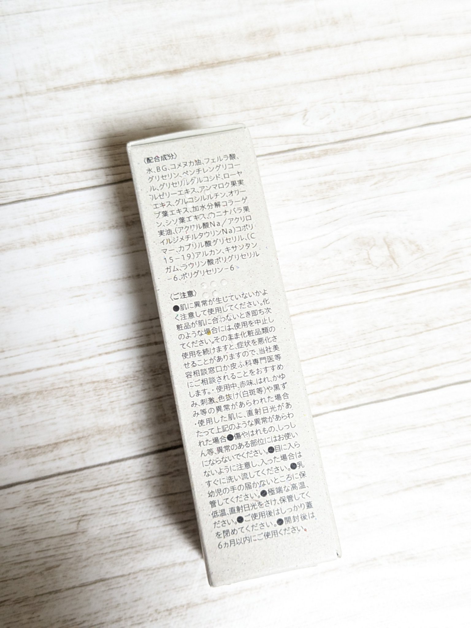 - 水、BG、コメヌカ油、フェルラ酸、グリセリン、ペンチレングリコール、グリセリルグルコシド、ローヤルゼリーエキス、アンマロク果実エキス、グルコシルルチン、オリーブ葉エキス、加水分解コラーゲン、シソ葉エキス、カニナバラ果実油、(アクリル酸Na/アクリロイルジメチルタウリンNa)コポリマー、カプリル酸グリセリル、(C15―19)アルカン、キサンタンガム、ラウリン酸ポリグリセリル―6、ポリグリセリン―6