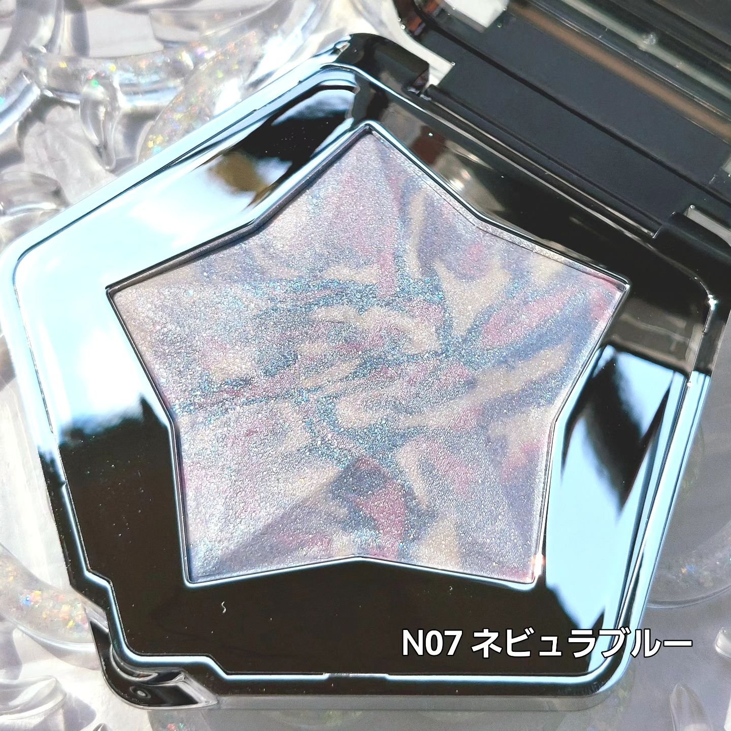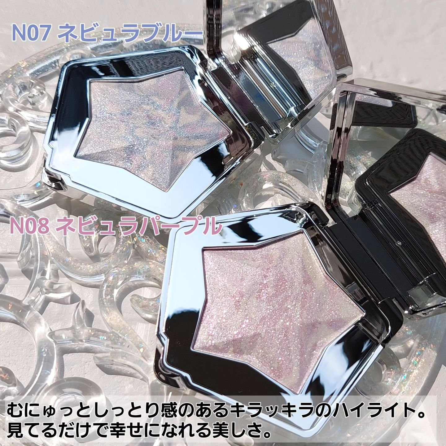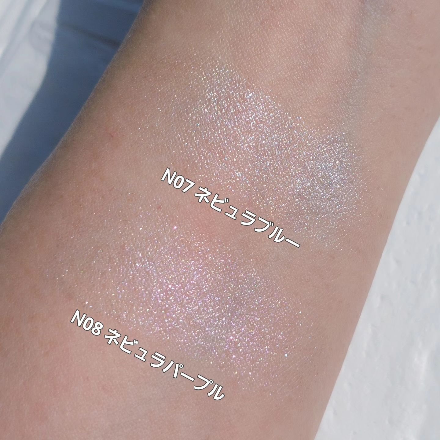 - 「ダイヤモンドのような輝き」天の川のように輝く、透明感と輝きに優れた真珠のような光沢。 複数のファインダイヤモンドの輝きを再現 <01 シルバーホワイト> シルバーホワイトのカラーが美しく輝いてツヤと透明感をプラス。なめらかでモチっとしたテクスチャーと小粒のラメが美しいツヤ肌を演出。Tゾーンや頬骨、デコルテなど光を与えたい部分に塗ればダイアモンドのように輝く。 <02 ライトシャンパン> ライトシャンパンのカラーが血色感と自然な光沢感をプラス。なめらかでモチっとしたテクスチャーと小粒のラメが美しいツヤ肌を演出。Tゾーンや頬骨、デコルテなど光を与えたい部分に塗ればダイアモンドのように輝く。 <03 シャンパンゴールド> シャンパンゴールドのカラーが表情を華やかに引き立てる。なめらかでモチっとしたテクスチャーと小粒のラメが美しいツヤ肌を演出。Tゾーンや頬骨、デコルテなど光を与えたい部分に塗ればダイアモンドのように輝く。 <05 シャンパンピンク> シャンパンピンクのカラーが血色感と透明感を与える。チークに重ねればピンクが引き立つ!なめらかでモチっとしたテクスチャーと小粒のラメが美しいツヤ肌を演出。Tゾーンや頬骨、デコルテなど光を与えたい部分に塗ればダイアモンドのように輝く。 <N01 シルバーホワイト> シルバーカラーのきらめきで、一瞬で透明感ある印象に。 小粒パール+大粒グリッターの組み合わせが、星屑のように繊細かつ大胆に煌めいてワンランク上のメイクに仕上げる。なめらか&モチっとした使用感で肌に高密着。 光を反射させる高屈折オイル配合でどの角度でもツヤ肌を実現。 鼻・頬・目頭・眉下以外にも、肩やデコルテに仕込めばお顔のツヤとリンクして、内から輝くような自然な印象に。 <N02 ライトシャンパン> ライトシャンパンのカラーが肌の色に自然になじみながら、ほどよいツヤと立体感をプラス。 小粒パール+大粒グリッターの組み合わせが、星屑のように繊細かつ大胆に煌めいてワンランク上のメイクに仕上げる。 なめらか&モチっとした使用感で肌に高密着。光を反射させる高屈折オイル配合でどの角度でもツヤ肌を実現。 鼻・頬・目頭・眉下以外にも、肩やデコルテに仕込めばお顔のツヤとリンクして、内から輝くような自然な印象に。 <N07 ネビュラブルー 日本限定色> ブルーとパープルの大粒ラメと、細かいシルバーラメが混ぜ合わさって色白な肌にツヤ感を与えてより明るく見せることができる! <N08 ネビュラパープル 日本限定色> パープルとピンク色の大粒ラメと、細かいシルバーラメが混ぜ合わさって、どのような肌色にもぴったり!かわいらしい雰囲気が作れる。