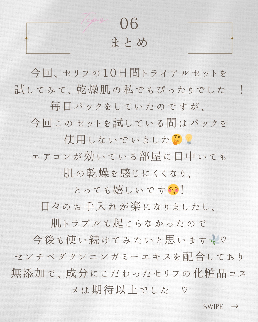 敏感肌の方でも使いやすいシンプルで効果的なスキンケアセット。中身はローション・セラム・クリームのミニボトルがinされた充実の内容です。 合成界面活性剤完全無添加・合成ポリマー、パラベン完全無添加。高機能成分の《センチペタクンニンガミー》が肌へ多方面からアプローチします。 私は特にクリームのしっとりしたコクが気に入りました。ほどよい固さで肌にぴたっと密着してくれる感じが心強いです。