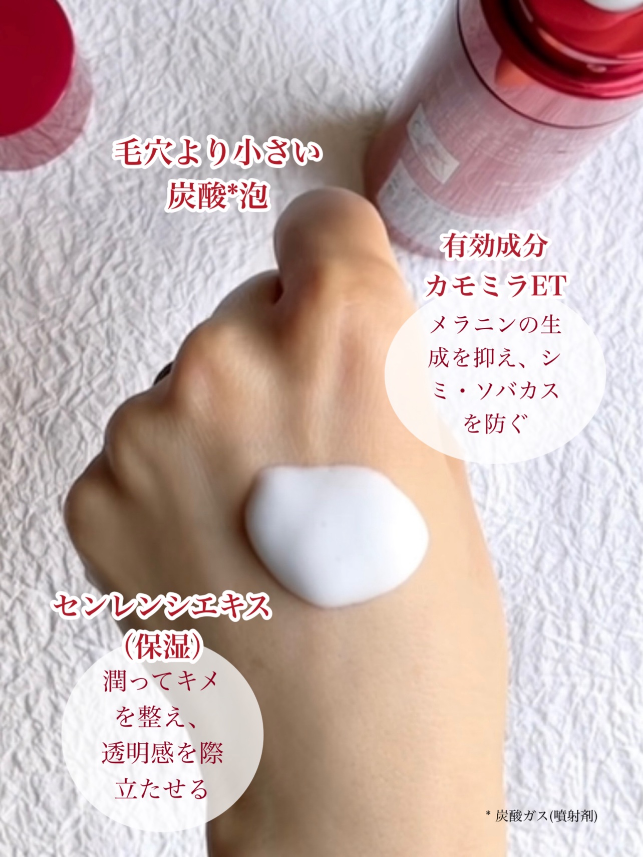 高密度*1マイクロ炭酸*2泡の美容液です。毛穴の約1/20サイズという「微細」、かつ、炭酸なのに弾けにくい『濃密マイクロバブル技術』を活用した艶やかな炭酸泡が、とろりと角層深く浸透する特徴があります。 「成分ファースト」にこだわって、日本で唯一*4薬用化粧品にALBLANCが配合している厳選成分、「センレンシエキス(保湿)」を配合し、潤って透明感溢れる肌へ導いてくれるそう! 泡がジュワジュワと消えていきながら肌に馴染んでいく工程が気持ちよく、楽しみながらスキンケアできています。しっとりとした使い心地も気に入っています。