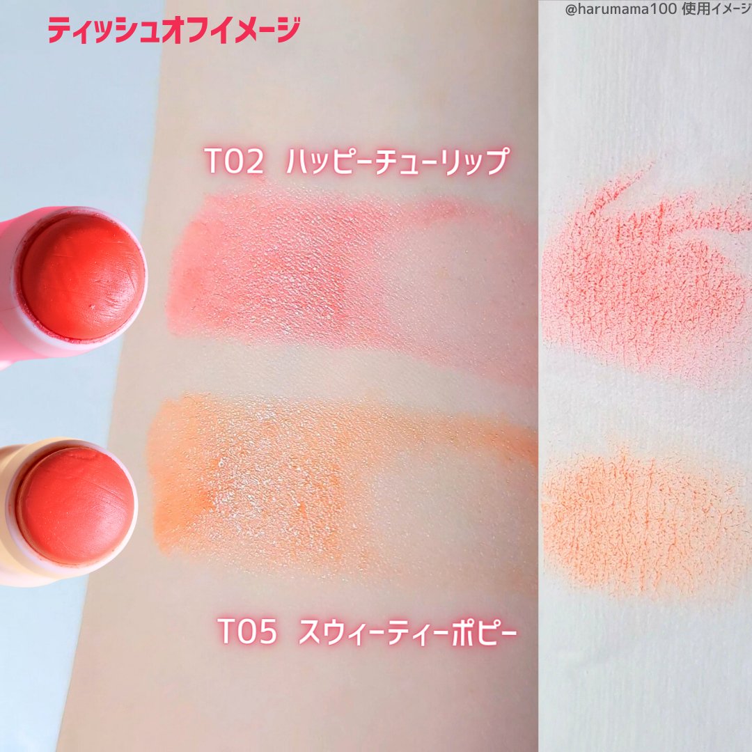 - <T03 ルビーカーネーション> トリエチルヘキサノイン、水添ポリイソブテン、ミネラルオイル、マイクロクリスタリンワックス、メトキシケイヒ酸エチルヘキシル、ポリエチレン、キャンデリラロウ、リンゴ酸ジイソステアリル、ワセリン、トコフェロール、クエン酸、クエン酸Na、カルボキシメチルヒアルロン酸Na、加水分解ヒアルロン酸、グリセリン、BG、水、ハチミツエキス、ヤシ油アルキルグルコシド、ローヤルゼリーエキス、ハチミツ、ザクロ果実エキス、プロポリスエキス、(+/-)赤104(1)、橙201、赤201、赤223、黄5、赤202、黄4、酸化チタン、ラウロイルリシン、水酸化Al、赤218、酸化鉄、シリカ、青1 <T05 スウィーティーポピー> トリエチルヘキサノイン、水添ポリイソブテン、ミネラルオイル、マイクロクリスタリンワックス、メトキシケイヒ酸エチルヘキシル、ポリエチレン、キャンデリラロウ、リンゴ酸ジイソステアリル、ワセリン、トコフェロール、クエン酸、クエン酸Na、カルボキシメチルヒアルロン酸Na、加水分解ヒアルロン酸、グリセリン、BG、水、ハチミツエキス、ヤシ油アルキルグルコシド、ローヤルゼリーエキス、ハチミツ、ザクロ果実エキス、プロポリスエキス、(+/-)赤104(1)、橙201、赤201、赤223、黄5、赤202、黄4、酸化チタン、ラウロイルリシン、水酸化Al、赤218、酸化鉄、シリカ、青1