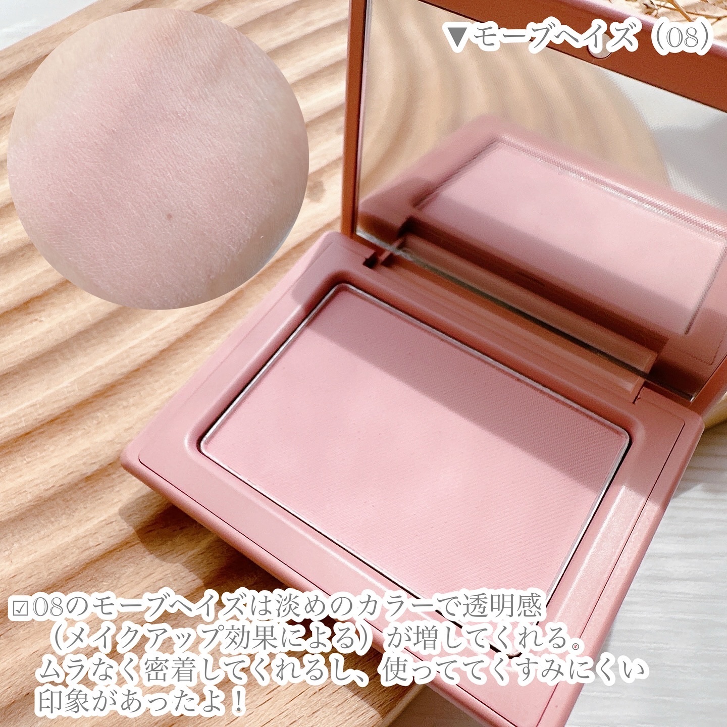 - 柔らかいベルベットパウダーがムラなく密着し、 くすみにくく明るい印象が続くブラーリングチークです。
