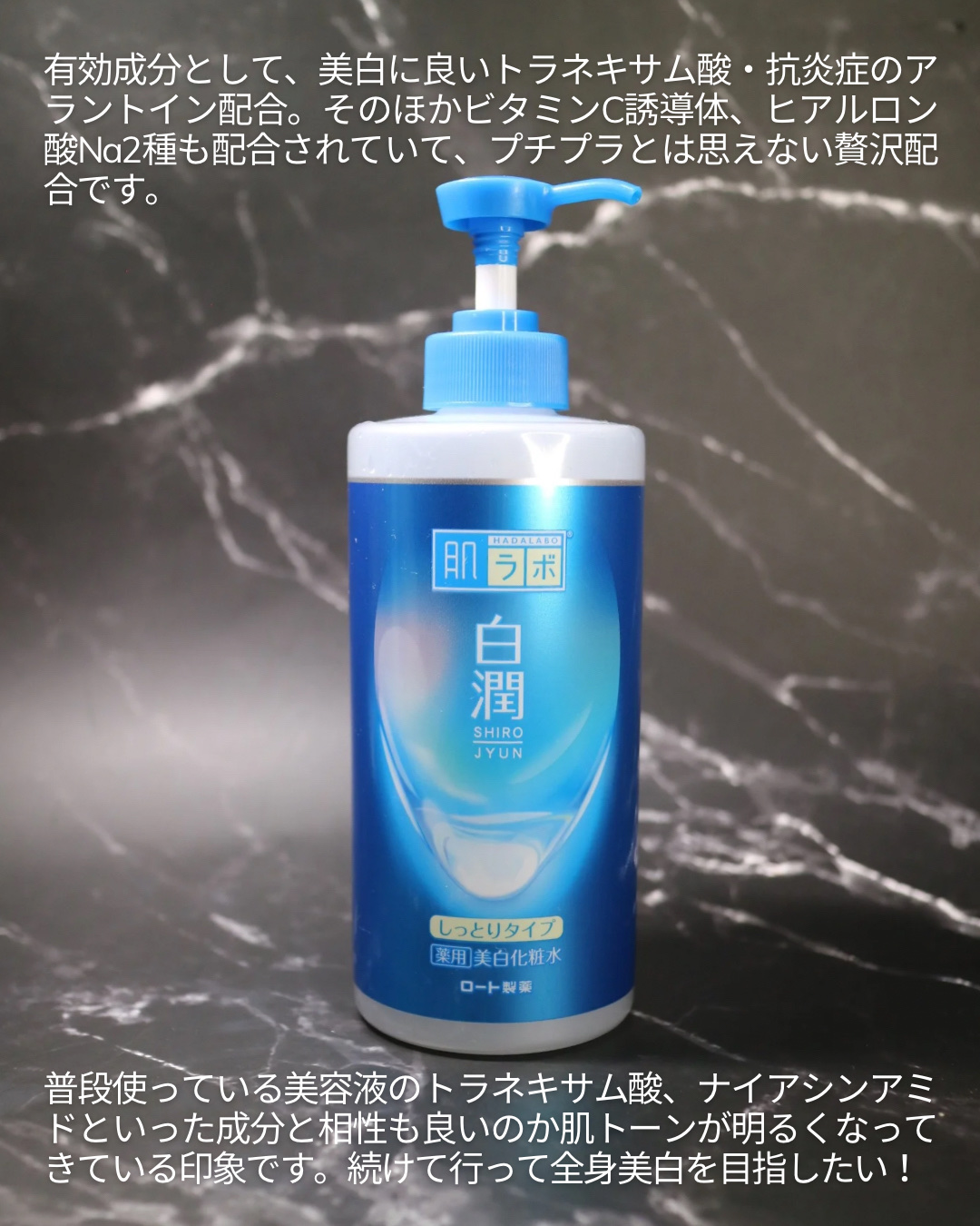- <ボトル 170ml> 有効成分 トラネキサム酸、アラントイン その他の成分 加水分解ヒアルロン酸(ナノ化ヒアルロン酸)、ヒアルロン酸Na-2、ビタミンCリン酸Mg (ビタミンC誘導体)、ビタミンE、ハトムギ発酵液、ヨクイニンエキス(ハトムギエキス)、BG、POE硬化ヒマシ油、フェノキシエタノール、無水クエン酸、安息香酸塩、トリ(カプリル・カプリン酸) グリセリル、シュガースクワラン、エデト酸塩、DPG、クエン酸、クエン酸Na <つめかえ用 170ml> 有効成分 トラネキサム酸、アラントイン その他の成分 加水分解ヒアルロン酸(ナノ化ヒアルロン酸)、ヒアルロン酸Na-2、ビタミンCリン酸Mg (ビタミンC誘導体)、ビタミンE、ハトムギ発酵液、ヨクイニンエキス(ハトムギエキス)、BG、POE硬化ヒマシ油、フェノキシエタノール、無水クエン酸、安息香酸塩、トリ(カプリル・カプリン酸) グリセリル、シュガースクワラン、エデト酸塩、DPG、クエン酸、クエン酸Na <大容量ポンプ 400ml> 有効成分 トラネキサム酸、アラントイン その他の成分 加水分解ヒアルロン酸(ナノ化ヒアルロン酸)、ヒアルロン酸Na-2、ビタミンCリン酸Mg (ビタミンC誘導体)、ビタミンE、ハトムギ発酵液、ヨクイニンエキス(ハトムギエキス)、BG、POE硬化ヒマシ油、フェノキシエタノール、無水クエン酸、安息香酸塩、トリ(カプリル・カプリン酸) グリセリル、シュガースクワラン、エデト酸塩、DPG、クエン酸、クエン酸Na