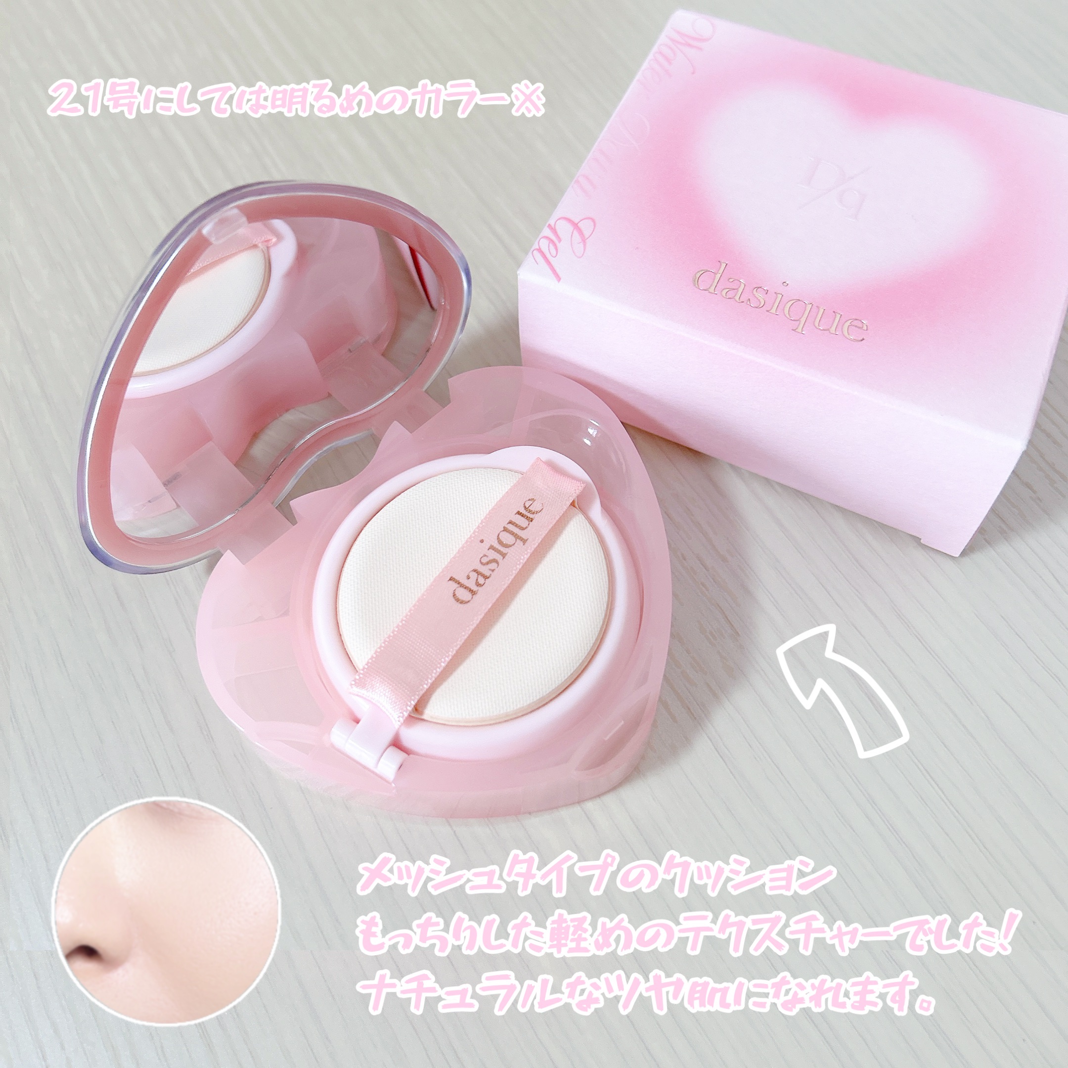 ぷっくりハートが可愛いdasique新作クッションファンデ💗 このハートの形のクッション楽しみにしてたんです✨ 通常パケは丸型でハート型は限定です。 テクスチャーは軽めなのですがモチッとした仕上がりで乾燥崩れしにくいと感じました!べたつきにくいところも良し。 Qoo10公式では2024年7月17日から発売されています!ハート型のパケは限定なので気になる方はお早めにチェックしてみてくださいね🫶💓