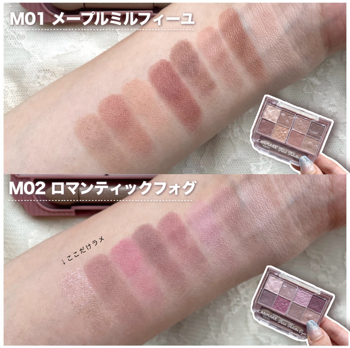 キャンメイクの人気パレットからマットタイプが発売🛒 今回は2色発売ですが更に1色追加されるらしく、キャンメイクの勢いが止まらない…! コンパクトなサイズ感&お値段はそのままで ふわっとマットな質感は秋冬メイクに使いやすそう。 M02 ロマンティックフォグは1色だけパール感がある質感なんだけど、それがいいアクセントになります◎