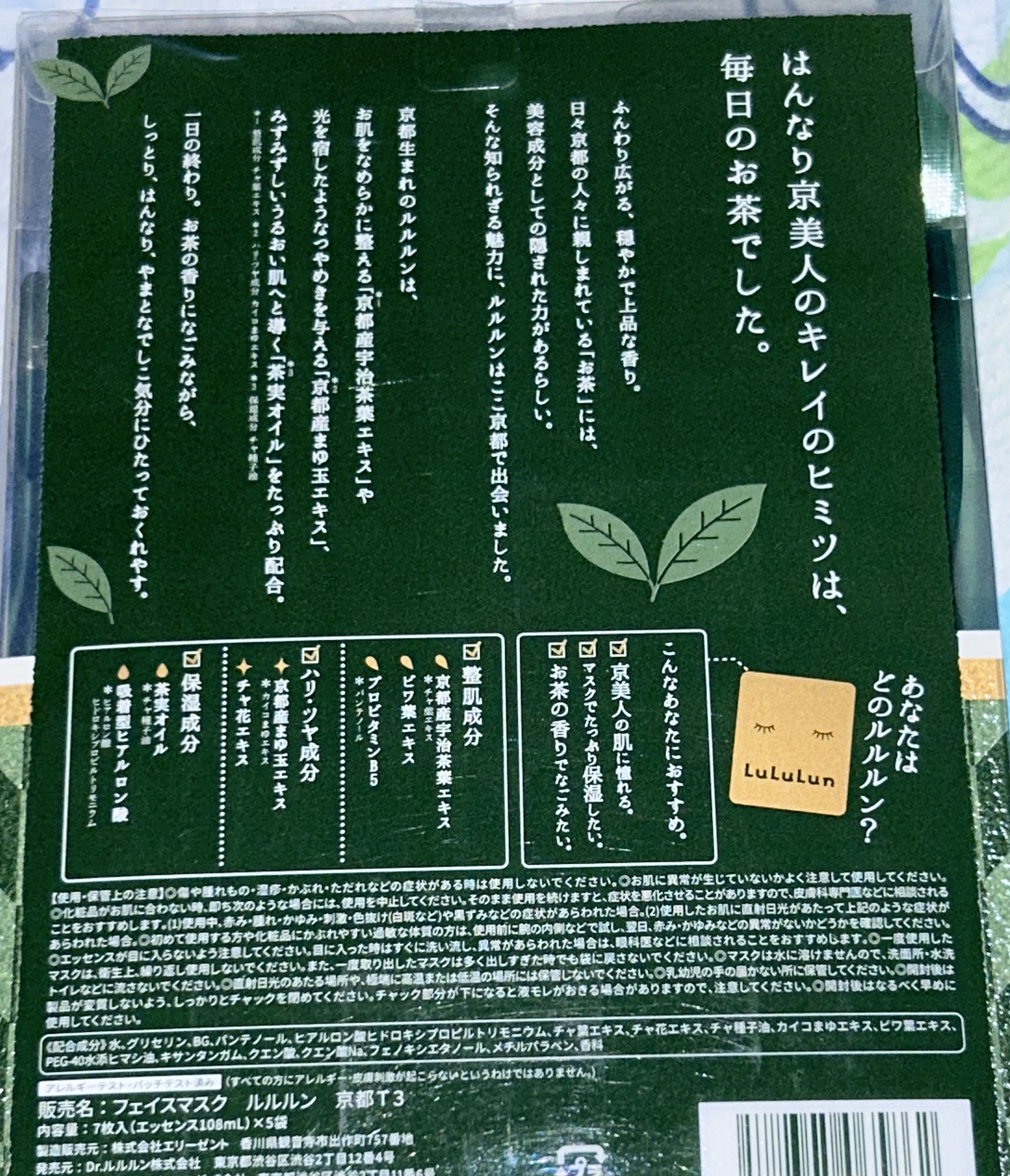 京都らしい、和で落ち着いたパッケージ!! においはお茶の花の香り🍵✨ 使用後は肌が保湿されてもちもちに💓 ルルルンのマスクは柔らかいのに破れにくいのがすごく好き!😊 京都に行ったらぜひ! 5袋もあるから、友達や自分のお土産に😊