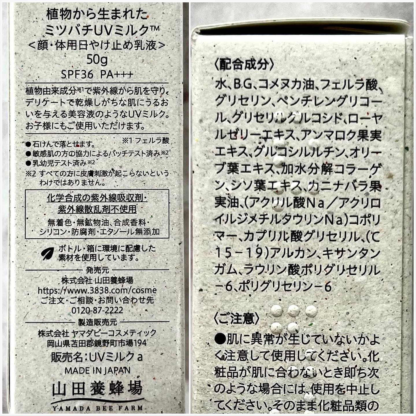 - 環境配慮も美容成分も、もちろん肌へのやさしさも。 自然と人を想い植物から生まれた顔・体用日焼け止めです。 希少なコメヌカ由来「フェルラ酸*」を採用し、化学合成の紫外線吸収剤も紫外線散乱剤も使用せず、植物の力でSPF36・PA+++を実現。これに加え、独自開発の「デセン酸含有ローヤルゼリーエキス**」と「コメヌカオイル**」を配合し、UVカットと、美肌ケアを両立しました。さらに 5 つの天然美容成分を配合し、美容成分 89%を叶えたエッセンスミルクのような使い心地のUVミルクです。 *整肌成分 **保湿成分