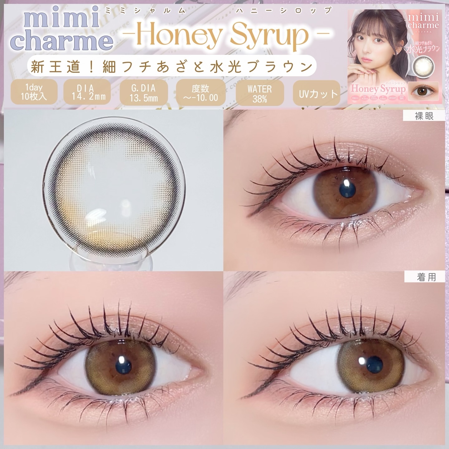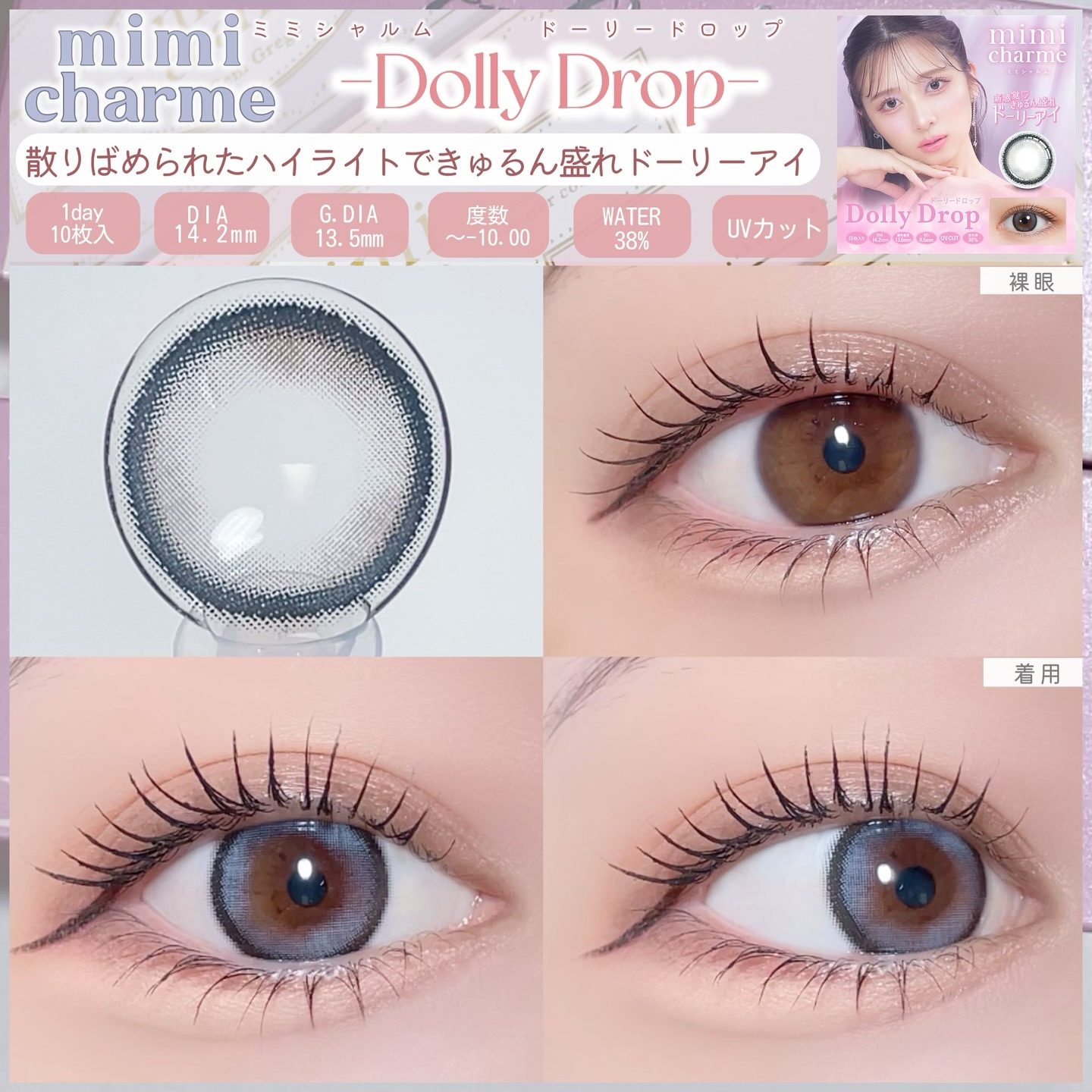 - 誰もが物語の主人公。 舞台の上でスポットライトを浴びているように瞳に魅力と光をまとわせ、毎日のわたしをより一層美しく輝かせる。 mimi charme(ミミシャルム)と一緒に物語の続きを。 <キティパフ> DIA14.2mm/着色直径13.8mm 太フチ無敵盛れ水光グレー あざと子猫ちゃんになれちゃう! 一軍太フチグレーレンズ <ジェムグレージュ> DIA14.2mm/着色直径13.5mm 細フチ大人っぽ水光グレージュ グレーなのにナチュラルでデイリー使いしやすい! <ドーリードロップ> DIA14.2mm/着色直径13.6mm 新感覚♡きゅるん盛れドーリーアイ 散りばめたブルーのハイライトがトレンド感満載! <ハニーシロップ> DIA14.2mm/着色直径13.5mm 細フチあざと水光ブラウン 新王道!垢抜け水光ブラウンレンズ <ムーンラテ> DIA14.2mm/着色直径13.0mm キラめき水光ミルキーベージュ オシャレな放射状ハイライトでまるで発光しているような瞳へ! <ロイヤルムーン> DIA14.2mm/着色直径13.0mm キラめき水光ミルキーグレー あの大人気カラームーンラテの色違い! 儚げうるみグレーレンズ カラーコンタクトレンズの不適正使用による眼障害の危険性等などがあります。 ●コンタクトレンズは高度管理医療機器です。不十分な洗浄・消毒など不適切なケアや、長時間・交換期間を超えた装用により、アレルギー性結膜炎、角膜感染症、角膜潰瘍等の重篤な眼障害が発生する危険性があります ●ご使用前に取扱説明書を確認してください 使用上の留意事項 ●眼科医院等を受診してからお求めください ●眼に異常を感じたら直ちにレンズ使用を中止し、お近くの眼科等で診察を受けてください ●医師の指示にしたがってご使用ください ●コンタクトレンズを装用する場合、自覚症状がなくても、眼科医院等での定期検査を受けてください ●レンズに不具合がある場合は使用しないでください