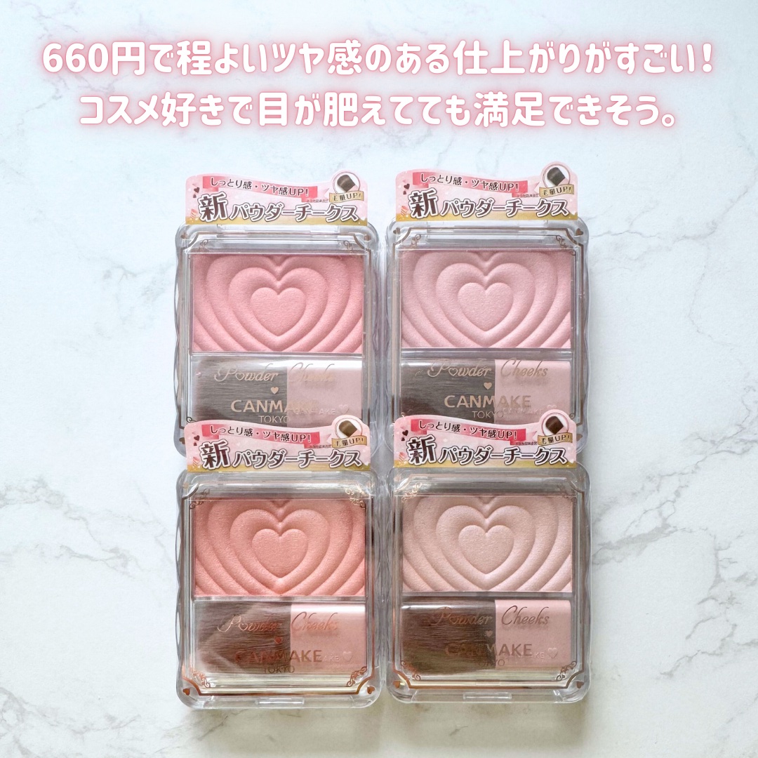 見た目がハート型で可愛いのに 粉質はしっとり付属のブラシもチクチクせず塗布できて660円はすごい🌸 透け感のあるツヤ仕上がりで P04はハイライトとして使うのも◎ 全部色味の違うピンクカラーでその日の気分やメイクに合わせて使い分けてる🌷