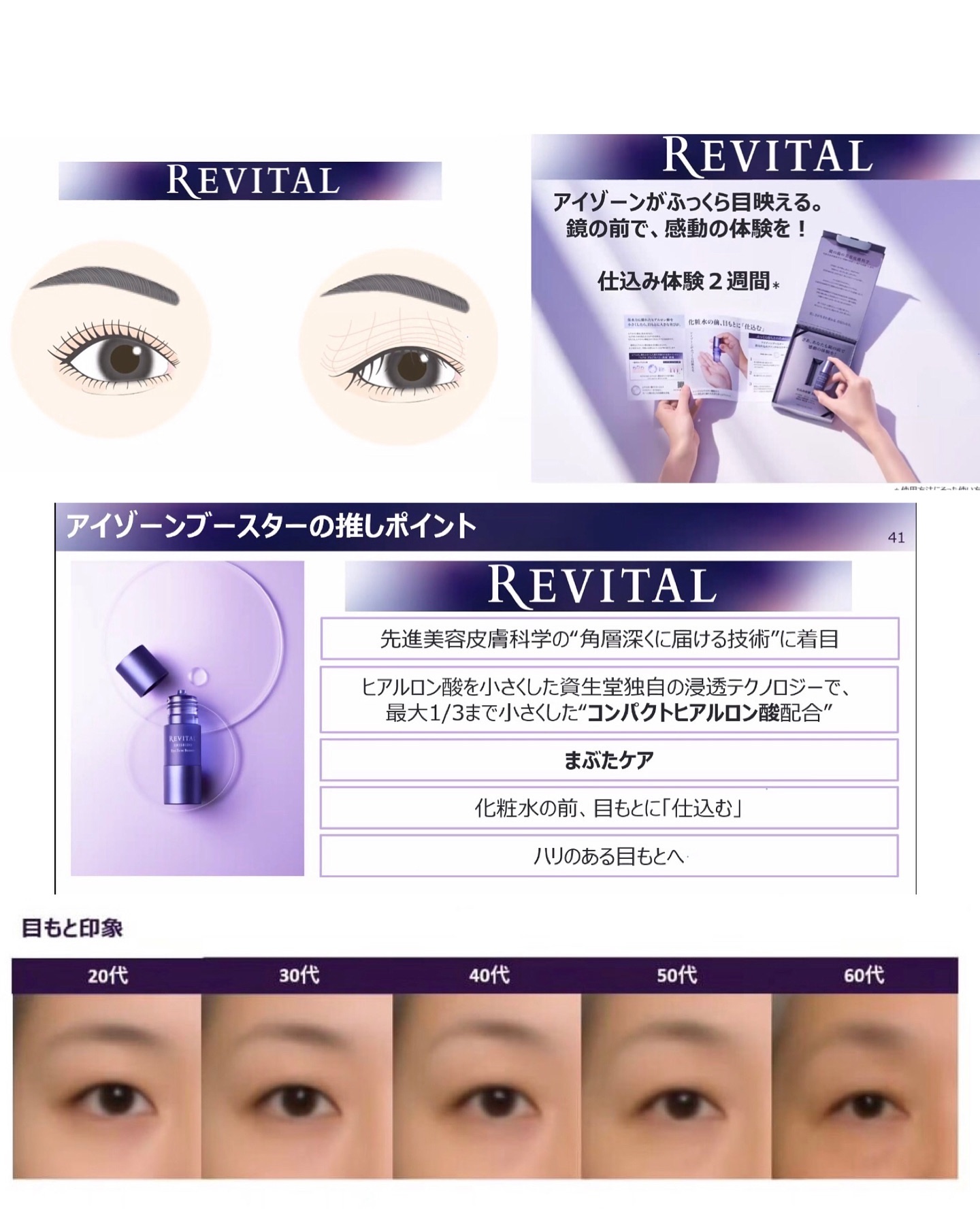年齢が分かりやすい目元にアプローチ 先進皮膚科学に基づいたリバイタルアイゾーンブースター 資生堂独自の技術で、大きい分子のヒアルロン酸を「保水力をそのままに、コンパクトヒアルロン酸* にして角層に入り込むことに成功」 これ1つでしっかりケアできるのが嬉しい~♡