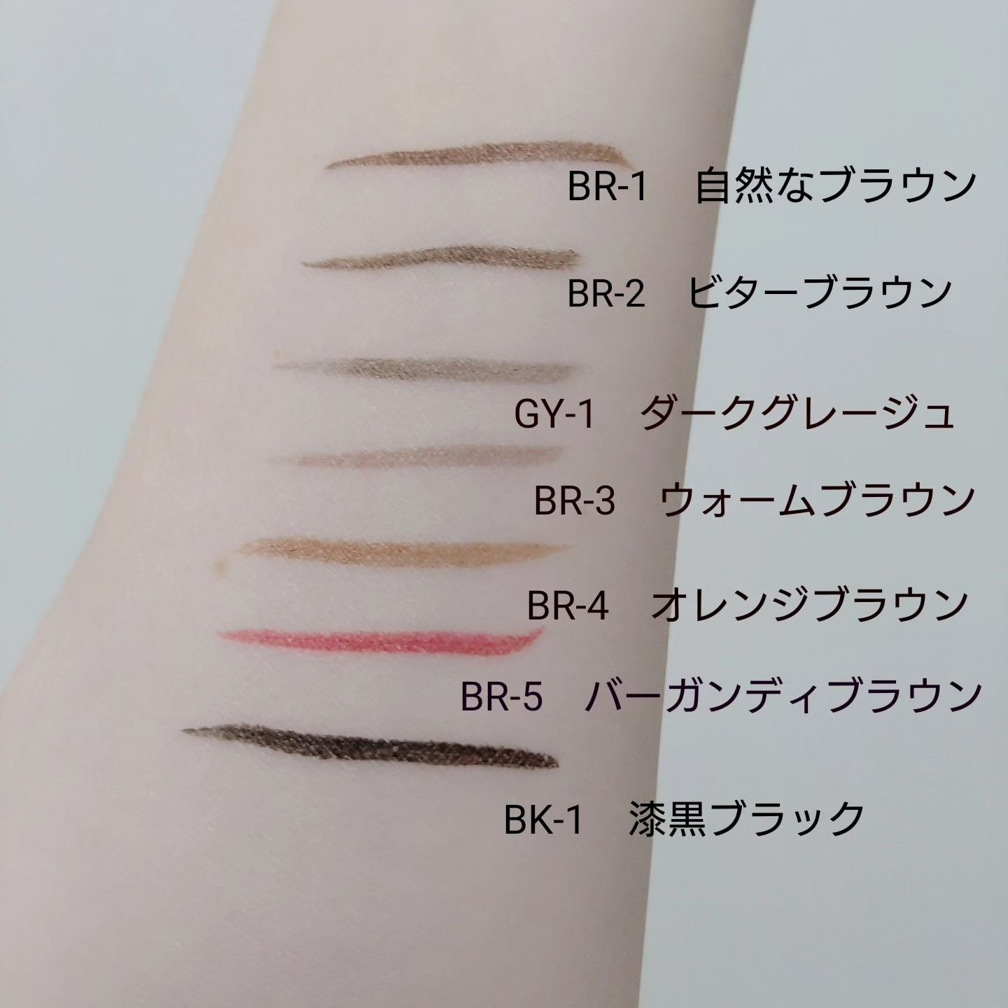 - <BK-1 漆黒ブラック> 水、BG、アクリレーツコポリマー、(アクリレーツ/アクリル酸エチルヘキシル)コポリマー、(スチレン/アクリレーツ)コポリマー、アクリレーツコポリマーアンモニウム、PEG-60水添ヒマシ油、DPG、ラウレス-21、AMP、(アクリレーツ/メタクリル酸ステアレス-20)コポリマー、EDTA-2Na、ポリグリセリル-3ジシロキサンジメチコン、クエン酸、ステアリン酸PEG-40、トリイソステアリン酸ポリグリセリル-2、ポリリシノレイン酸ポリグリセリル-6、セスキイソステアリン酸ソルビタン、フェノキシエタノール、メチルパラベン、エチルパラベン、(+/-)カーボンブラック、酸化鉄、赤226、(チタン/酸化チタン)焼結物 <BR-1 自然なブラウン> 水、BG、アクリレーツコポリマー、(アクリレーツ/アクリル酸エチルヘキシル)コポリマー、(スチレン/アクリレーツ)コポリマー、アクリレーツコポリマーアンモニウム、PEG-60水添ヒマシ油、DPG、ラウレス-21、AMP、(アクリレーツ/メタクリル酸ステアレス-20)コポリマー、EDTA-2Na、ポリグリセリル-3ジシロキサンジメチコン、クエン酸、ステアリン酸PEG-40、トリイソステアリン酸ポリグリセリル-2、ポリリシノレイン酸ポリグリセリル-6、セスキイソステアリン酸ソルビタン、フェノキシエタノール、メチルパラベン、エチルパラベン、(+/-)カーボンブラック、酸化鉄、赤226、(チタン/酸化チタン)焼結物 <BR-2 ビターブラウン> 水、BG、アクリレーツコポリマー、(アクリレーツ/アクリル酸エチルヘキシル)コポリマー、(スチレン/アクリレーツ)コポリマー、アクリレーツコポリマーアンモニウム、PEG-60水添ヒマシ油、DPG、ラウレス-21、AMP、(アクリレーツ/メタクリル酸ステアレス-20)コポリマー、EDTA-2Na、ポリグリセリル-3ジシロキサンジメチコン、クエン酸、ステアリン酸PEG-40、トリイソステアリン酸ポリグリセリル-2、ポリリシノレイン酸ポリグリセリル-6、セスキイソステアリン酸ソルビタン、フェノキシエタノール、メチルパラベン、エチルパラベン、(+/-)カーボンブラック、酸化鉄、赤226、(チタン/酸化チタン)焼結物 <BR-3 ウォームブラウン> 水、BG、アクリレーツコポリマー、(アクリレーツ/アクリル酸エチルヘキシル)コポリマー、(スチレン/アクリレーツ)コポリマー、アクリレーツコポリマーアンモニウム、PEG-60水添ヒマシ油、DPG、ラウレス-21、AMP、(アクリレーツ/メタクリル酸ステアレス-20)コポリマー、EDTA-2Na、ポリグリセリル-3ジシロキサンジメチコン、クエン酸、ステアリン酸PEG-40、トリイソステアリン酸ポリグリセリル-2、ポリリシノレイン酸ポリグリセリル-6、セスキイソステアリン酸ソルビタン、フェノキシエタノール、メチルパラベン、エチルパラベン、(+/-)カーボンブラック、酸化鉄、赤226、(チタン/酸化チタン)焼結物 <GY-1 ダークグレージュ> 水、BG、アクリレーツコポリマー、(アクリレーツ/アクリル酸エチルヘキシル)コポリマー、(スチレン/アクリレーツ)コポリマー、アクリレーツコポリマーアンモニウム、PEG-60水添ヒマシ油、DPG、ラウレス-21、AMP、(アクリレーツ/メタクリル酸ステアレス-20)コポリマー、EDTA-2Na、ポリグリセリル-3ジシロキサンジメチコン、クエン酸、ステアリン酸PEG-40、トリイソステアリン酸ポリグリセリル-2、ポリリシノレイン酸ポリグリセリル-6、セスキイソステアリン酸ソルビタン、フェノキシエタノール、メチルパラベン、エチルパラベン、(+/-)カーボンブラック、酸化鉄、赤226、(チタン/酸化チタン)焼結物 <BK-1 漆黒ブラック(レフィル)> 水、BG、アクリレーツコポリマー、(アクリレーツ/アクリル酸エチルヘキシル)コポリマー、(スチレン/アクリレーツ)コポリマー、アクリレーツコポリマーアンモニウム、PEG-60水添ヒマシ油、DPG、ラウレス-21、AMP、(アクリレーツ/メタクリル酸ステアレス-20)コポリマー、EDTA-2Na、ポリグリセリル-3ジシロキサンジメチコン、クエン酸、ステアリン酸PEG-40、トリイソステアリン酸ポリグリセリル-2、ポリリシノレイン酸ポリグリセリル-6、セスキイソステアリン酸ソルビタン、フェノキシエタノール、メチルパラベン、エチルパラベン、(+/-)カーボンブラック、酸化鉄、赤226、(チタン/酸化チタン)焼結物 <BR-1 自然なブラウン(レフィル)> 水、BG、アクリレーツコポリマー、(アクリレーツ/アクリル酸エチルヘキシル)コポリマー、(スチレン/アクリレーツ)コポリマー、アクリレーツコポリマーアンモニウム、PEG-60水添ヒマシ油、DPG、ラウレス-21、AMP、(アクリレーツ/メタクリル酸ステアレス-20)コポリマー、EDTA-2Na、ポリグリセリル-3ジシロキサンジメチコン、クエン酸、ステアリン酸PEG-40、トリイソステアリン酸ポリグリセリル-2、ポリリシノレイン酸ポリグリセリル-6、セスキイソステアリン酸ソルビタン、フェノキシエタノール、メチルパラベン、エチルパラベン、(+/-)カーボンブラック、酸化鉄、赤226、(チタン/酸化チタン)焼結物 <BR-2 ビターブラウン(レフィル)> 水、BG、アクリレーツコポリマー、(アクリレーツ/アクリル酸エチルヘキシル)コポ