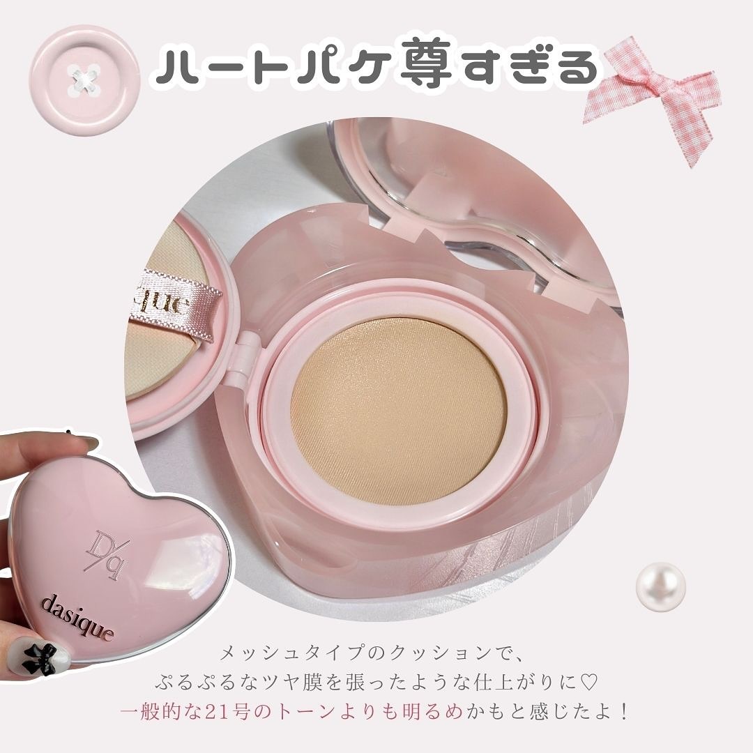 ぷっくりハートが可愛いdasique新作クッションファンデ💗 このハートの形のクッション楽しみにしてたんです✨ 通常パケは丸型でハート型は限定です。 テクスチャーは軽めなのですがモチッとした仕上がりで乾燥崩れしにくいと感じました!べたつきにくいところも良し。 Qoo10公式では2024年7月17日から発売されています!ハート型のパケは限定なので気になる方はお早めにチェックしてみてくださいね🫶💓