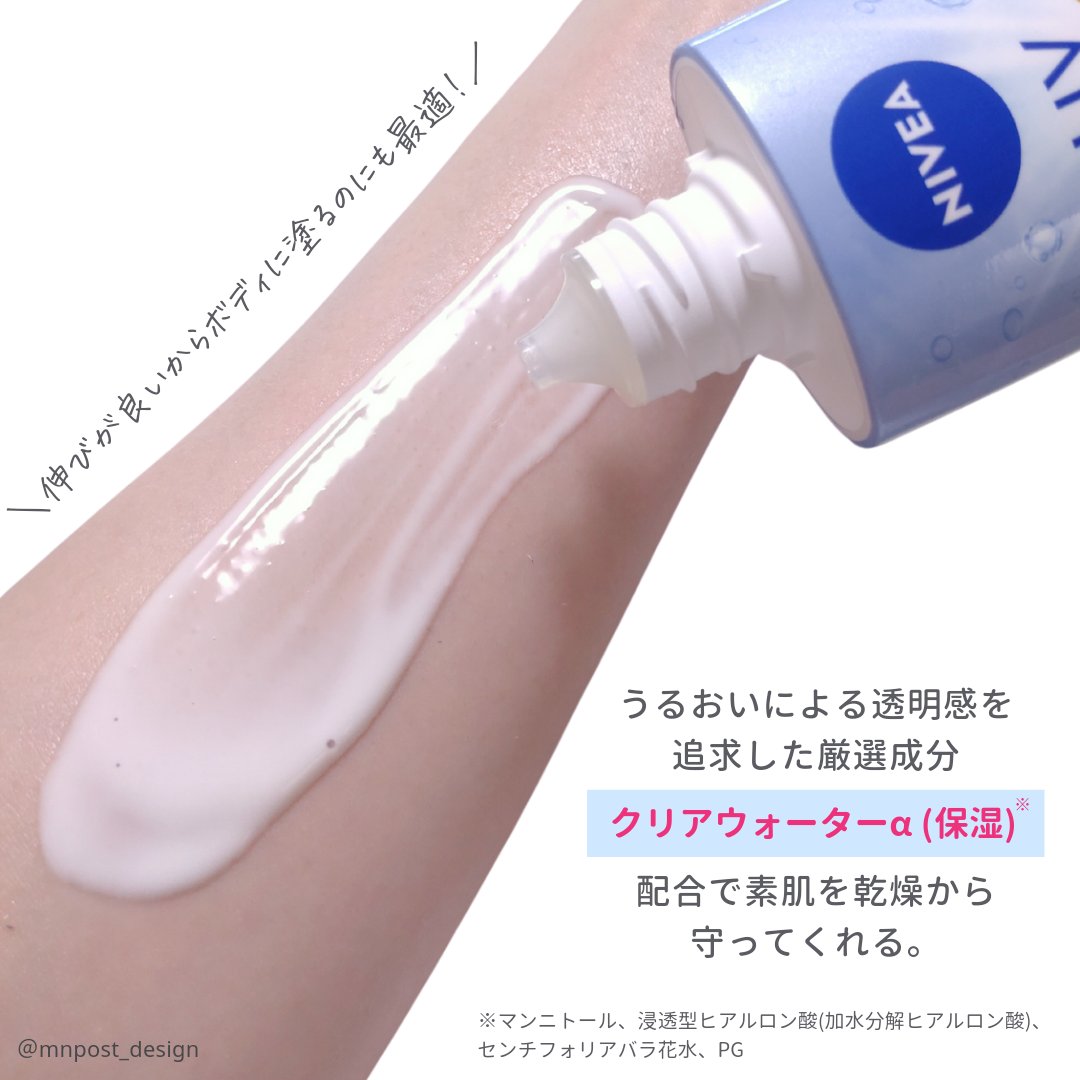 ニベアUVスーパーウォータージェル EXとってもみずみずしいジェルでのびがよくてお気に入り☀️ベタつく暑い日もさらっと濡れるので塗り直しにもいい!SPF50+PA++++でこの使用感は嬉しいです❣️香りもすっきり華やか🌼顔、身体用なので全身使...
