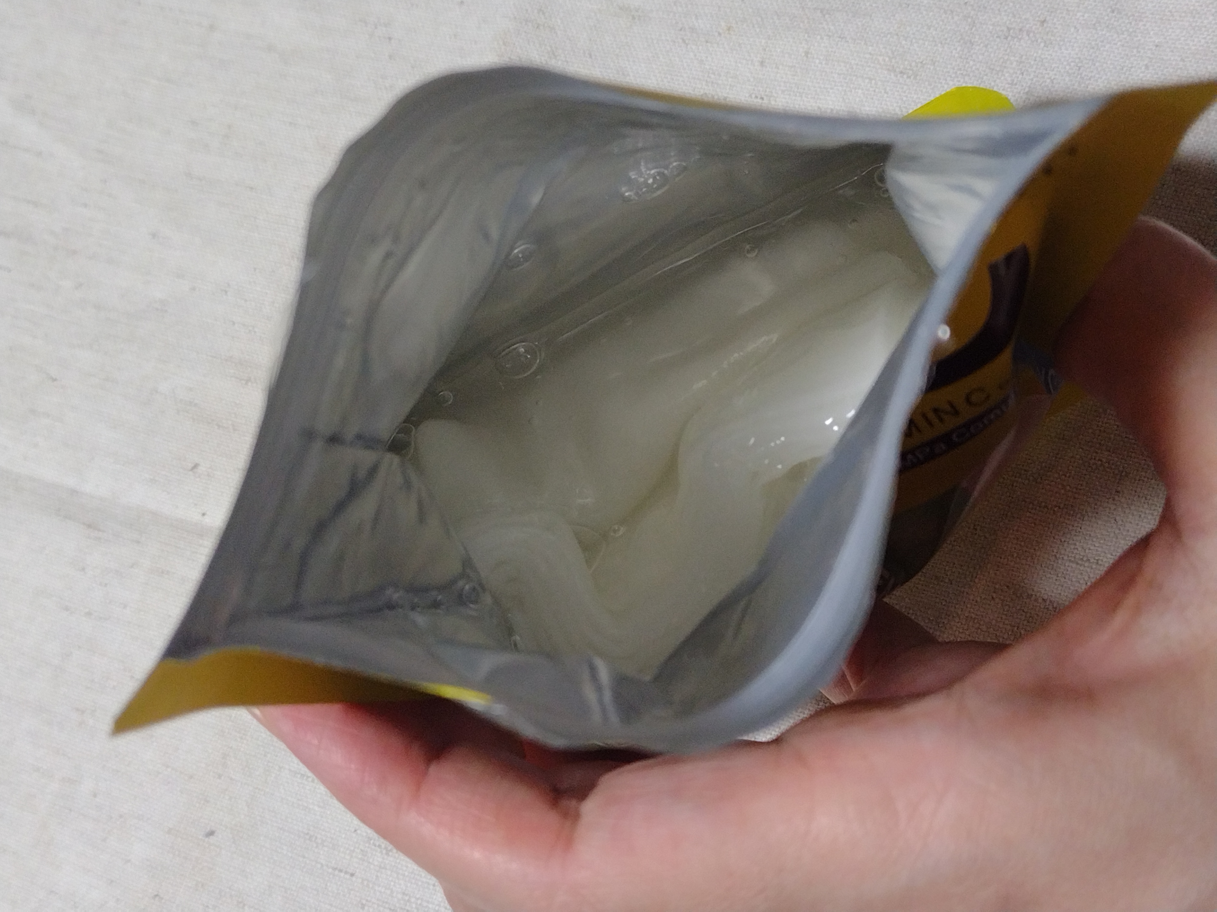 中身は、さらっとなめらかなテクスチャー。ほんのりピンクがかったベージュ系のようなカラー。のびがよく、しっとりとした使用感です。べたつきにくく、なじませやすい印象です。豆腐のなめらかなくちあたりをイメージするような使い心地でしょうか。(個人の体...