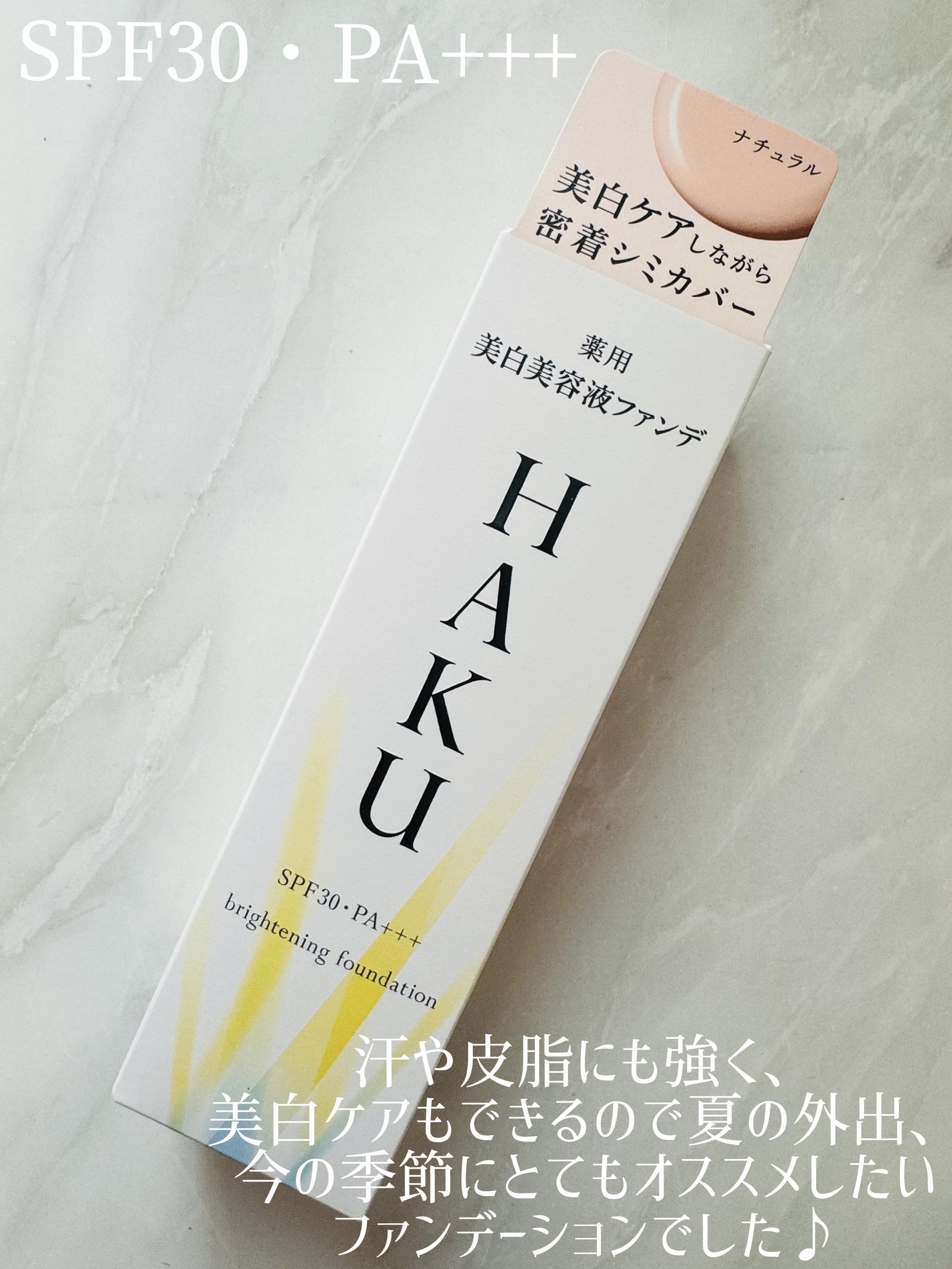 - SPF30 PA+++ 美白ケアしながら密着してシミカバーするファンデーション。 美白有効成分がメラニンの生成を抑え、シミ・そばかすを防ぎます。 軽やかに広がり、気になるシミや色ムラに密着して目立たせず、みずみずしいうるおいが長時間続きます。 明るく自然な仕上がりで、シミの目立たない、美発光肌へ。 無香料 (販売名:HAKU ブライトニングファンデーション)