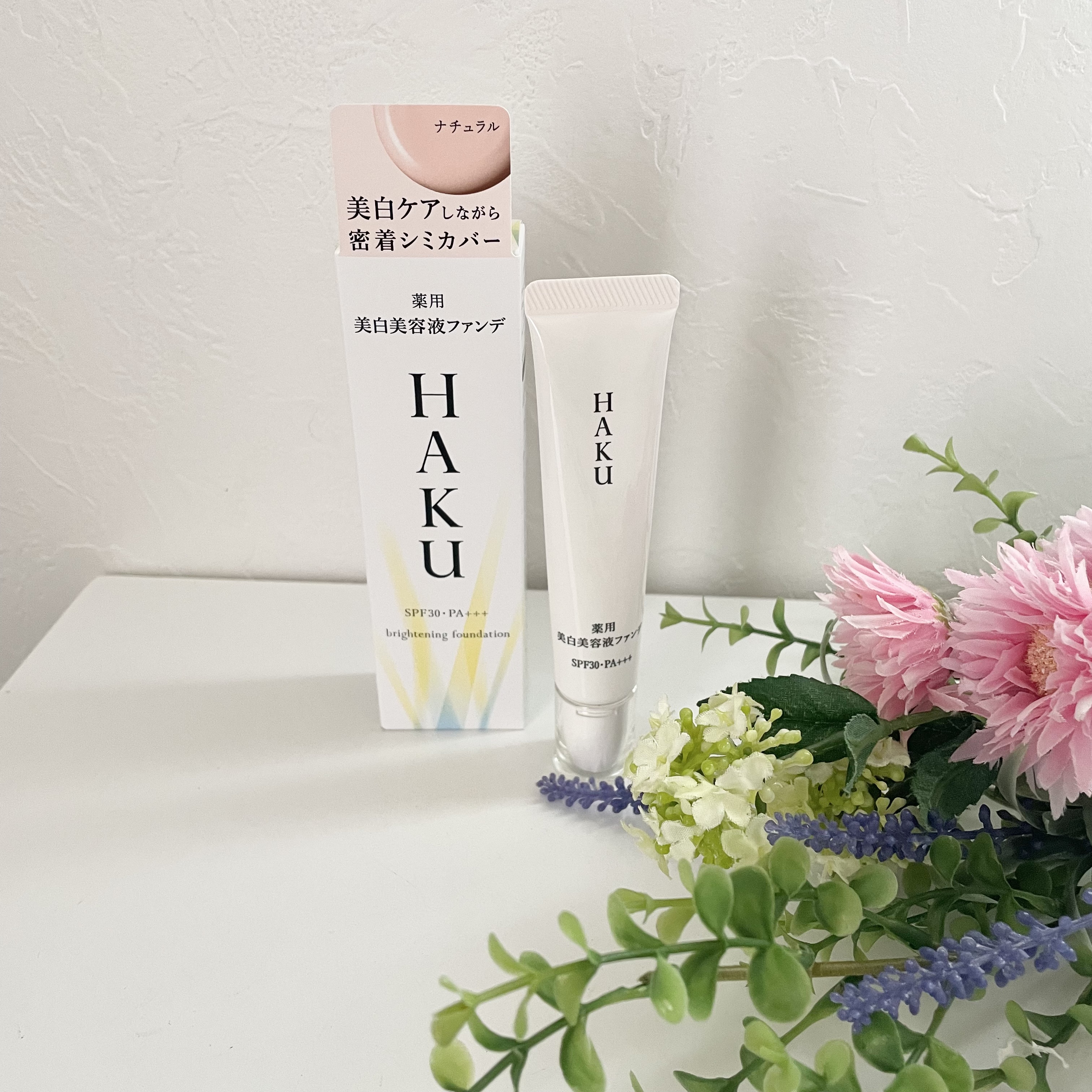 - SPF30 PA+++ 美白ケアしながら密着してシミカバーするファンデーション。 美白有効成分がメラニンの生成を抑え、シミ・そばかすを防ぎます。 軽やかに広がり、気になるシミや色ムラに密着して目立たせず、みずみずしいうるおいが長時間続きます。 明るく自然な仕上がりで、シミの目立たない、美発光肌へ。 無香料 (販売名:HAKU ブライトニングファンデーション)