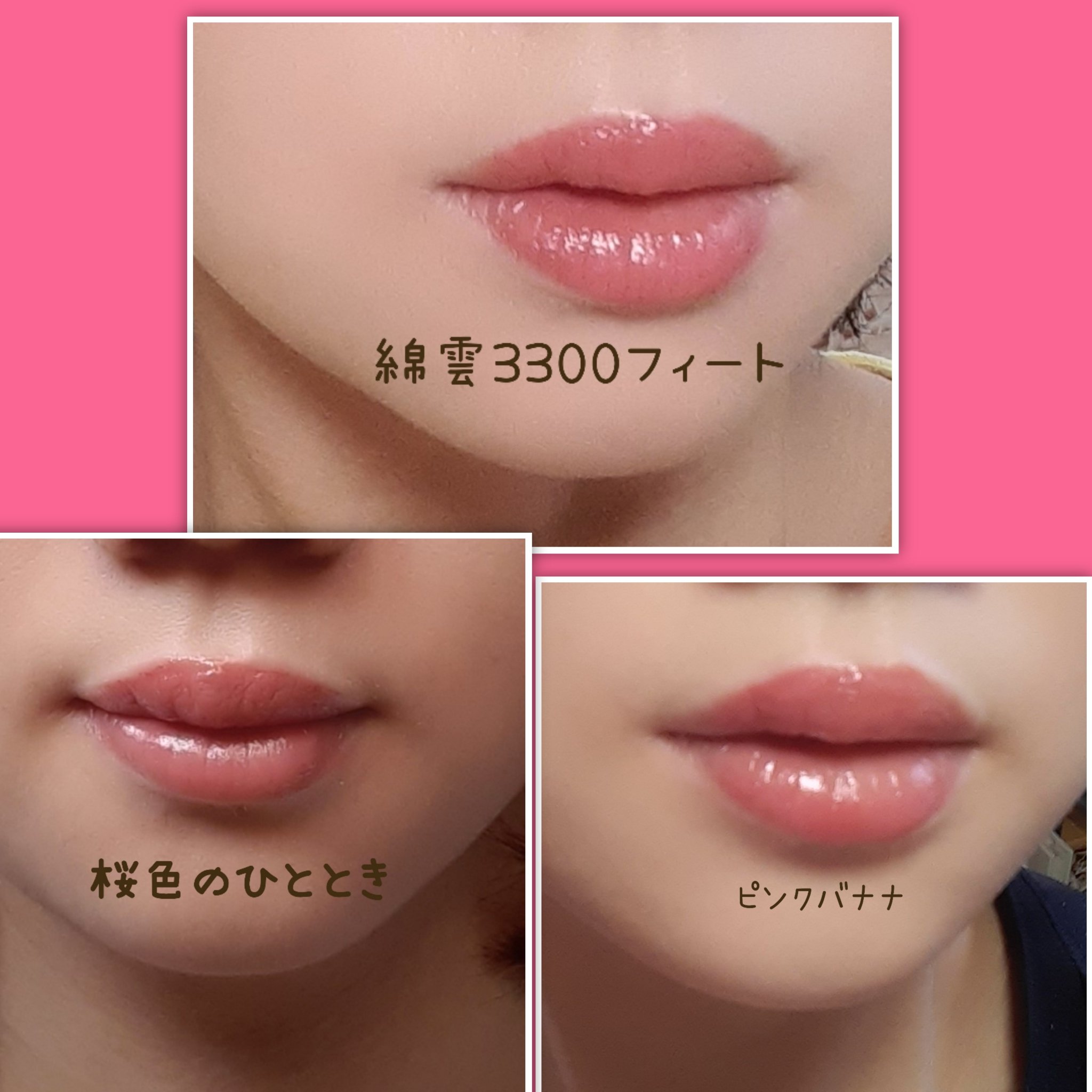ピンクバナナがやや蛍光ピンク化しやすいのと、その状態で内側から落ちてくると境目が分かりやすいかな? 桜色のひと時がちょっと痒くなる気がするけど気のせいかな?💦 ピンクバナナが一番しっかりピンクだけど、落ち着いてるから全然使いやすい!