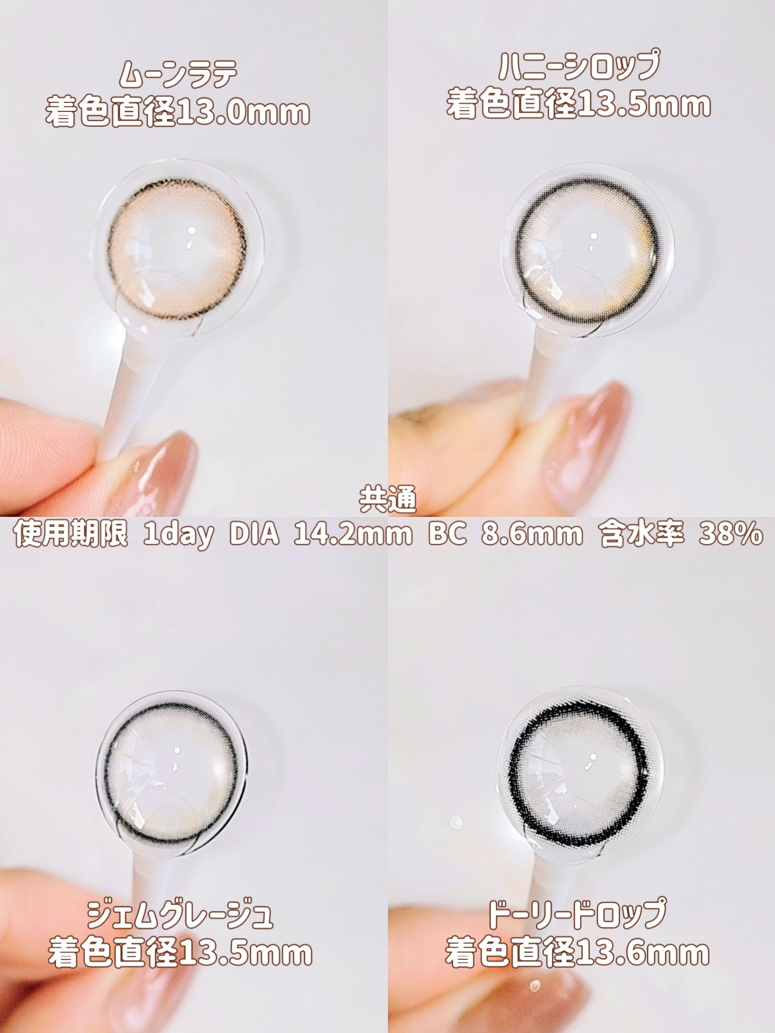 - 誰もが物語の主人公。 舞台の上でスポットライトを浴びているように瞳に魅力と光をまとわせ、毎日のわたしをより一層美しく輝かせる。 mimi charme(ミミシャルム)と一緒に物語の続きを。 <キティパフ> DIA14.2mm/着色直径13.8mm 太フチ無敵盛れ水光グレー あざと子猫ちゃんになれちゃう! 一軍太フチグレーレンズ <ジェムグレージュ> DIA14.2mm/着色直径13.5mm 細フチ大人っぽ水光グレージュ グレーなのにナチュラルでデイリー使いしやすい! <ドーリードロップ> DIA14.2mm/着色直径13.6mm 新感覚♡きゅるん盛れドーリーアイ 散りばめたブルーのハイライトがトレンド感満載! <ハニーシロップ> DIA14.2mm/着色直径13.5mm 細フチあざと水光ブラウン 新王道!垢抜け水光ブラウンレンズ <ムーンラテ> DIA14.2mm/着色直径13.0mm キラめき水光ミルキーベージュ オシャレな放射状ハイライトでまるで発光しているような瞳へ! <ロイヤルムーン> DIA14.2mm/着色直径13.0mm キラめき水光ミルキーグレー あの大人気カラームーンラテの色違い! 儚げうるみグレーレンズ カラーコンタクトレンズの不適正使用による眼障害の危険性等などがあります。 ●コンタクトレンズは高度管理医療機器です。不十分な洗浄・消毒など不適切なケアや、長時間・交換期間を超えた装用により、アレルギー性結膜炎、角膜感染症、角膜潰瘍等の重篤な眼障害が発生する危険性があります ●ご使用前に取扱説明書を確認してください 使用上の留意事項 ●眼科医院等を受診してからお求めください ●眼に異常を感じたら直ちにレンズ使用を中止し、お近くの眼科等で診察を受けてください ●医師の指示にしたがってご使用ください ●コンタクトレンズを装用する場合、自覚症状がなくても、眼科医院等での定期検査を受けてください ●レンズに不具合がある場合は使用しないでください