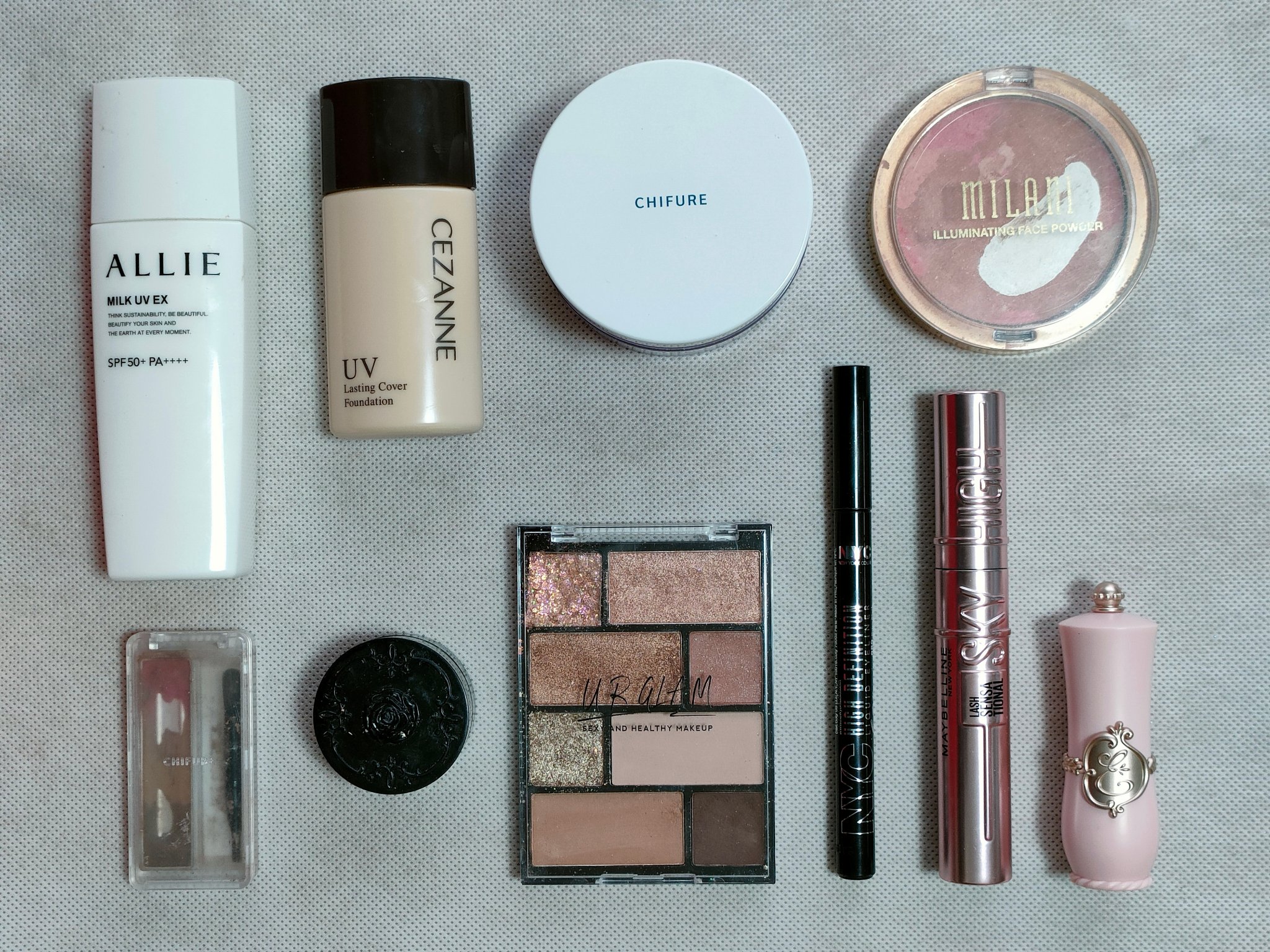 アリィー ニュアンスチェンジUV ジェル RSを、顔全体にまんべんなく塗ります。 RMK RMK ジェルクリーミィファンデーション 103を、顔全体にまんべんなく塗ります。 ジョンソンベビー ジョンソン ベビーパウダーを、顔全体にまんべんなく軽くはたきます。 THE BODY SHOP bronze shade warm glowを、両頬に塗ります。 KATE リフレクトミラーアイズ BR-1の締め色を、眉毛全体にまんべんなく塗ります。 URGLAM UR GLAMBLOOMING EYE COLOR PALETTE 01を、使用しました。 ちふれ リキッド アイライナー 筆ペンタイプ BK30 ブラックを、塗ります。 CEZANNE エアリーカールマスカラを、まつ毛全体にまんべんなく塗ります。 MAYBELLINE NEW YORK コロッサルボリュームエクスプレスを、まつ毛全体にまんべんなく塗ります。 MAYBELLINE NEW YORK SPステイ マットインク 135を、唇全体にまんべんなく塗ります。