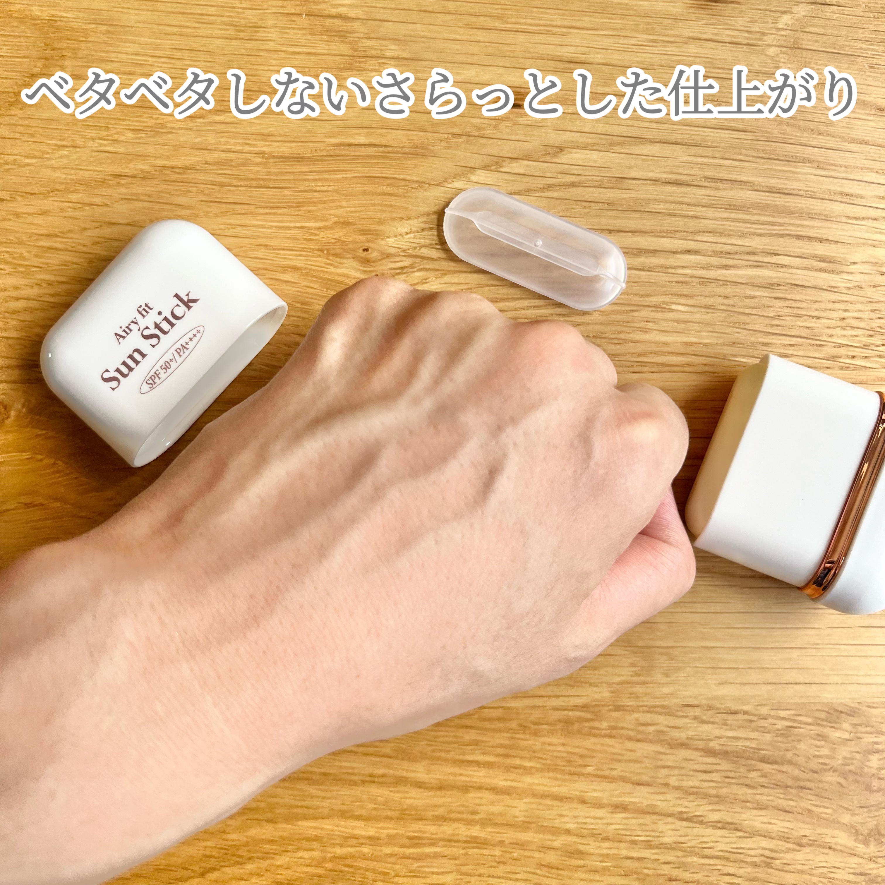 - ベタつきやテカりがなく、サラッとしたエアリーなテクスチャー。 手を汚さずに直接塗れて、メイクの上から塗り直しが可能です。 水や汗はもちろん、砂がついてもサラサラだから、レジャーシーンでも大活躍すること間違いなし。 空気のような軽さで密着し、べたつかずサラサラの肌に。 独自開発のウォーターブースティング技術を採用、長時間UVケアを叶える日焼け止めスティック。 #エアリーフィット #持ち運びサイズ #いつでもどこでも #メイクの上にもさらっと密着 ☑SPF50+、PA++++ ☑3種のプルーフ: ①水に強いウォータープルーフ ②サラサラで砂が付きにくいサンドプルーフ ③汗や皮脂で落ちにくいスウェットプルーフ ☑2つの独自開発技術採用 ①ウォーターブースティング技術:汗や水分に反応してSPF効果が高まり、UVケア効果が長持ち。 ②ポリメリックハイテンパー技術:高い気温の中でも、長時間SPF効果を維持します。 ☑さらさら肌を演出: べたつかず肌のテカりを押さえ、重ね塗りをしても肌に負担のない軽い使用感。 パウダーを塗ったようなサラサラ肌に。 ☑いつでもどこでも持ち運びサイズ: 特定のイヤホンケースにぴったりはまるサイズ感。ケースに入れてキーホルダーにように持ち歩いても◎