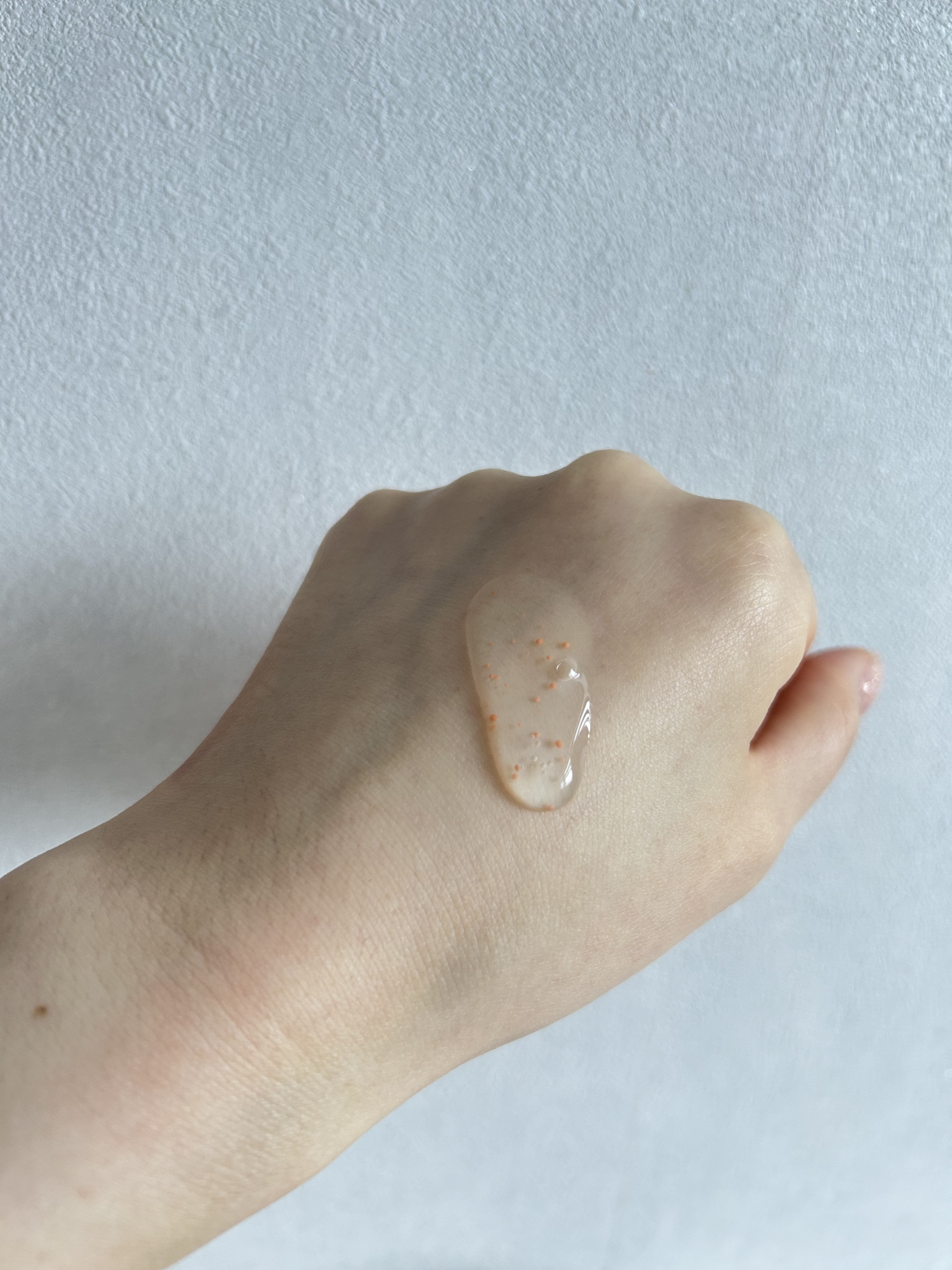 カフェイン成分配合で浮腫みケアもでき、 ヒアルロン,ペプチド配合で美容液の効果もあります! ポンプから出した時は硬めのジェルテクスチャーで、粒々が入っており、見た目はスクラブみたいですが、肌に伸ばすと、すっーと伸びて、肌に馴染んで自然な艶がでます! 匂いは少し独特な感じですか、めちゃめちゃ気になる程では無かったので大丈夫かなと思いました。