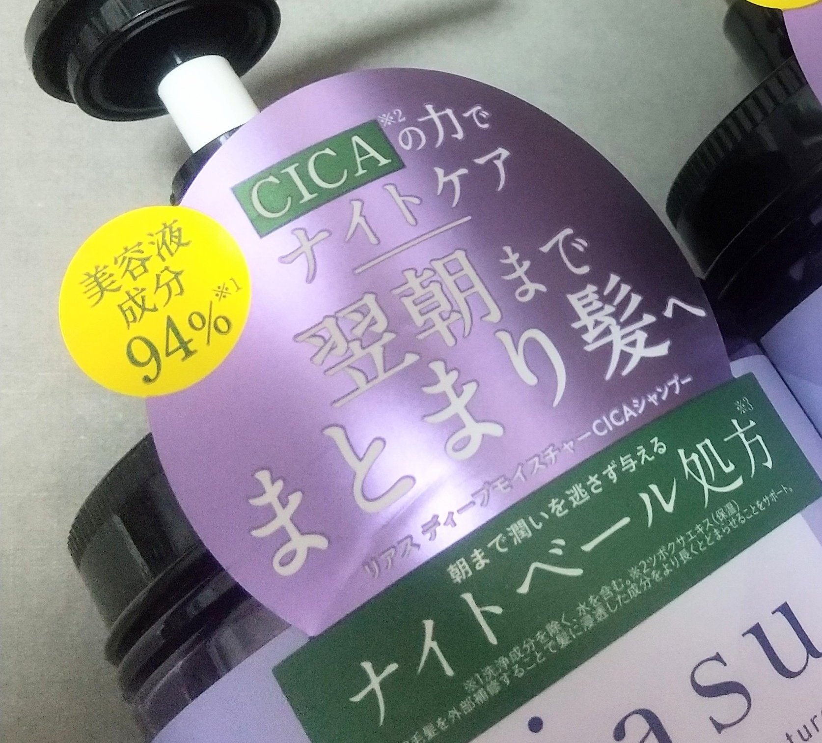 - ①独自のCICA water glowセラム ※3を新配合 使用感向上のために独自のCICA water glowセラム※3を新配合。CICA成分※2の力だけでなく、保湿やダメージ補修まで叶えるスペシャルなセラム成分です。 また、年齢と共に髪の悩みも多様化していく中で、頭皮と髪を同時にケアできるようにCICA water glowセラム ※3をはじめとした、頭皮環境を整える成分を配合しています。 ②ナイトベール処方で眠る時間をケアタイムに 眠る前にしっかりとヘアケアをしても、睡眠中に髪から成分が逃げてしまったり、枕や髪同士の摩擦によってダメージを与えてしまうと満足のいかない仕上がりになることも。 riasu deep moisture CICA shampoo & treatment 独自のナイトベール処方で、浸透した成分の持続をサポートし、さらに摩擦から髪を守ります。充実のケア成分だけでなく、そのケア成分の力を余すことなく感じていただける処方です。 ③美容液成分94%以上配合。しっとりまとまる贅沢な仕上がりに 寝起きにより効果を体感いただくためにリニューアル後の製品はより保湿力を高めた処方となっております。洗い上がりだけでなく、翌朝までしっとりまとまる扱いやすい髪へと導くヘアケアをお楽しみください。 また、髪がきしむとのお声を一部いただき、メインの洗浄成分をアミノ酸系の洗浄成分に変更いたしました。 ※1…デイリーランキング 2023/1/30更新 2023年1/19集計 ※2…ツボクサエキス(保湿) ※3…ツボクサエキス(保湿)、加水分解ヒアルロン酸(保湿)、加水分解ケラチン(カシミヤヤギ)(補修)