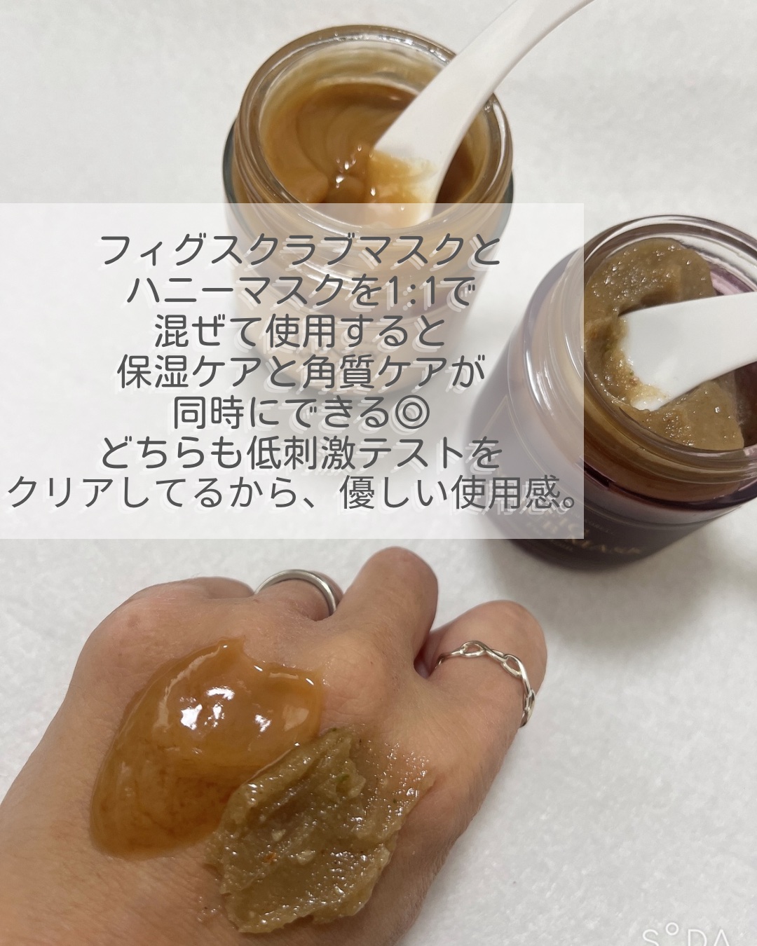 ハニーマスクは、乾燥知らずへ。 保湿力続くウォッシュオフマスクなんだそうです。天然はちみつ原料をそのまま配合し、保湿感が続くみたい! フィグスクラブマスクは、保湿までしてくれる一石二鳥のスクラブなんだって。フィグとは、イチジクのこと。イチジクに満ちたプロテイン分解酵素「フィシン(Ficin)成分が、古い角質をやさしく綺麗にしてくれるんだって。 ハニーマスクは、柔らかくてとろけそうなほど。しっとりしてて、ベタつかず、かなり柔らかいマスクだと思います。