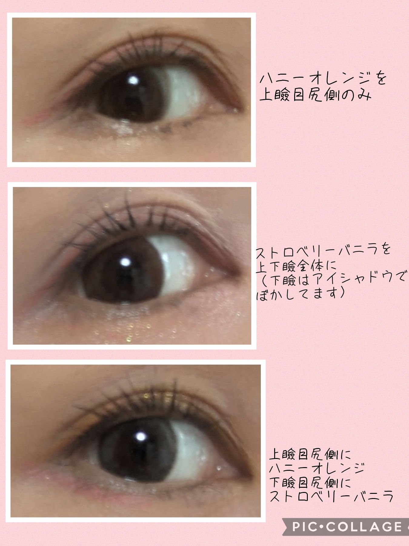 フーミー シングルラメシャドウ☆キアラベージュ ①ブラシでアイホール全体に。 #提供 HOLIKA HOLIKAマイフェイブムードアイパレット 9カラーの タロットリーダー☆ ②ブラシで二重幅に。 ③指で黒目の上辺りにポンポン。 #提供 SISTER ANNウォータープルーフペンシルアイライナー☆ 06BABY PEACHを下瞼全体に描く。 最後、②のカラーでぼかす。