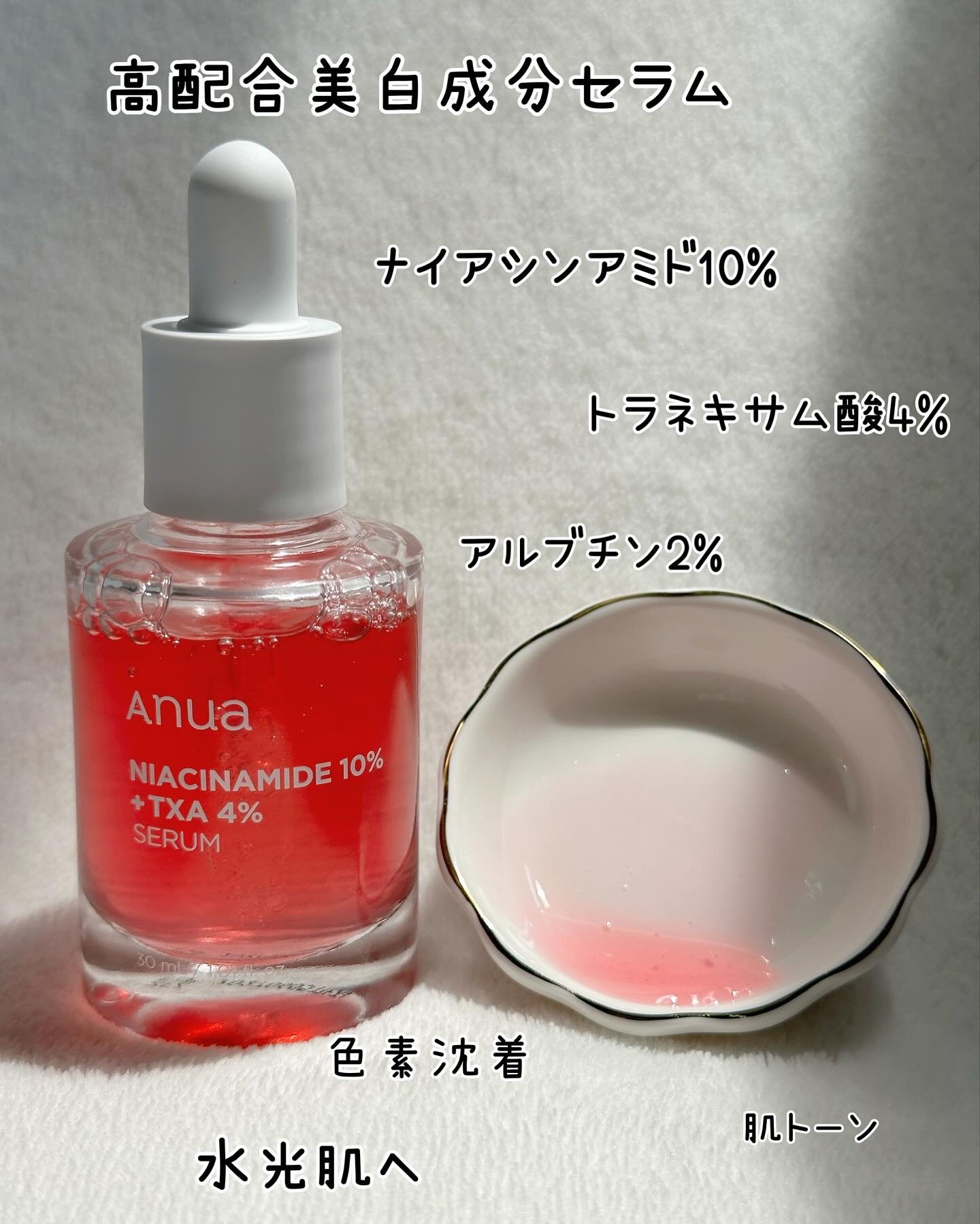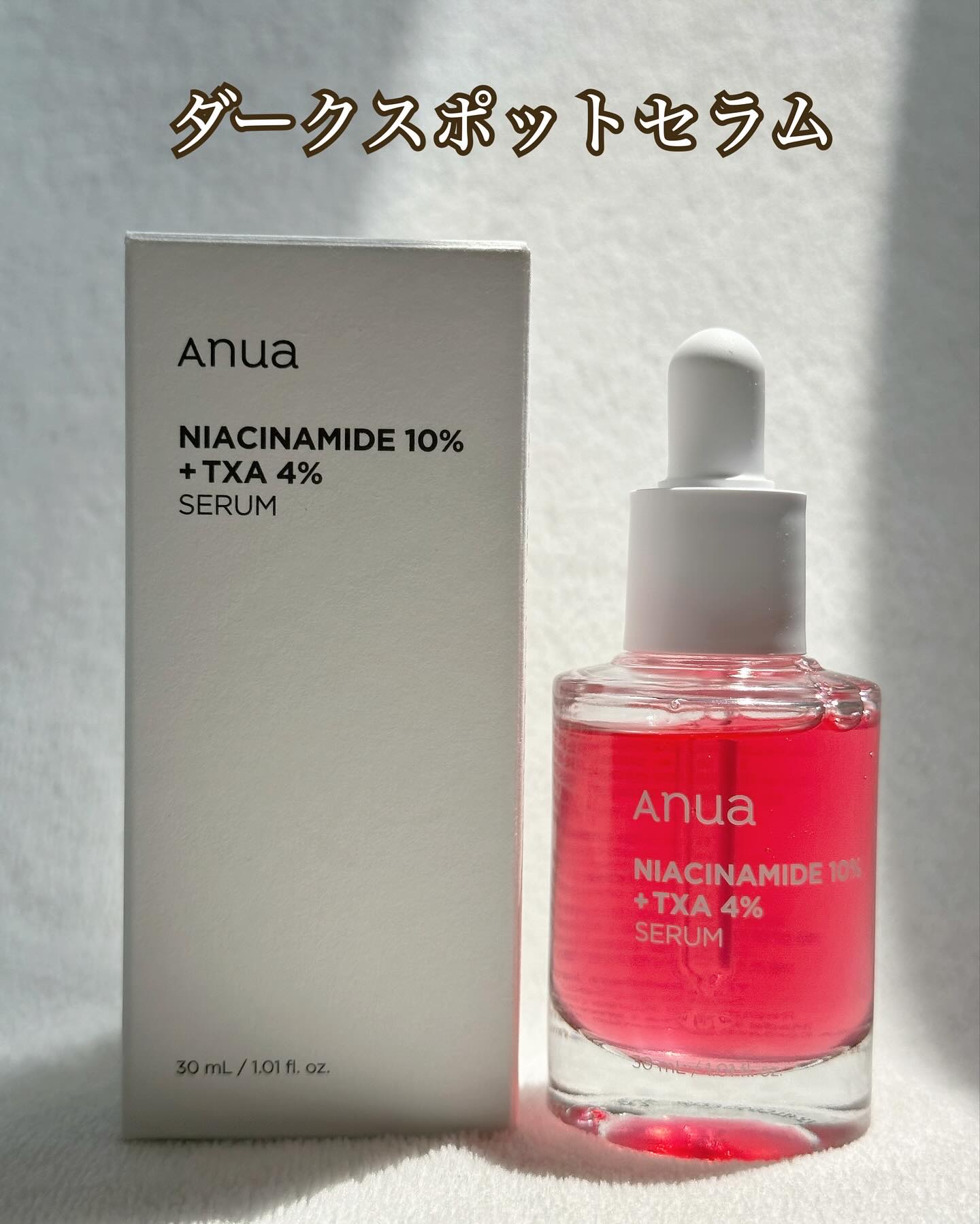 Anuaの真っ赤な美白* セラム🫶❤️ ▶︎ダークスポットセラム ♡ナイアシンアミド10% ♡トラネキサム酸4% ♡アルブチン2% と 美白* 成分が豪華に高配合💖 攻めの美白* 美容液なのに、朝夕関係なく肌への負担なく毎日誰でも使えるよ😉❣️