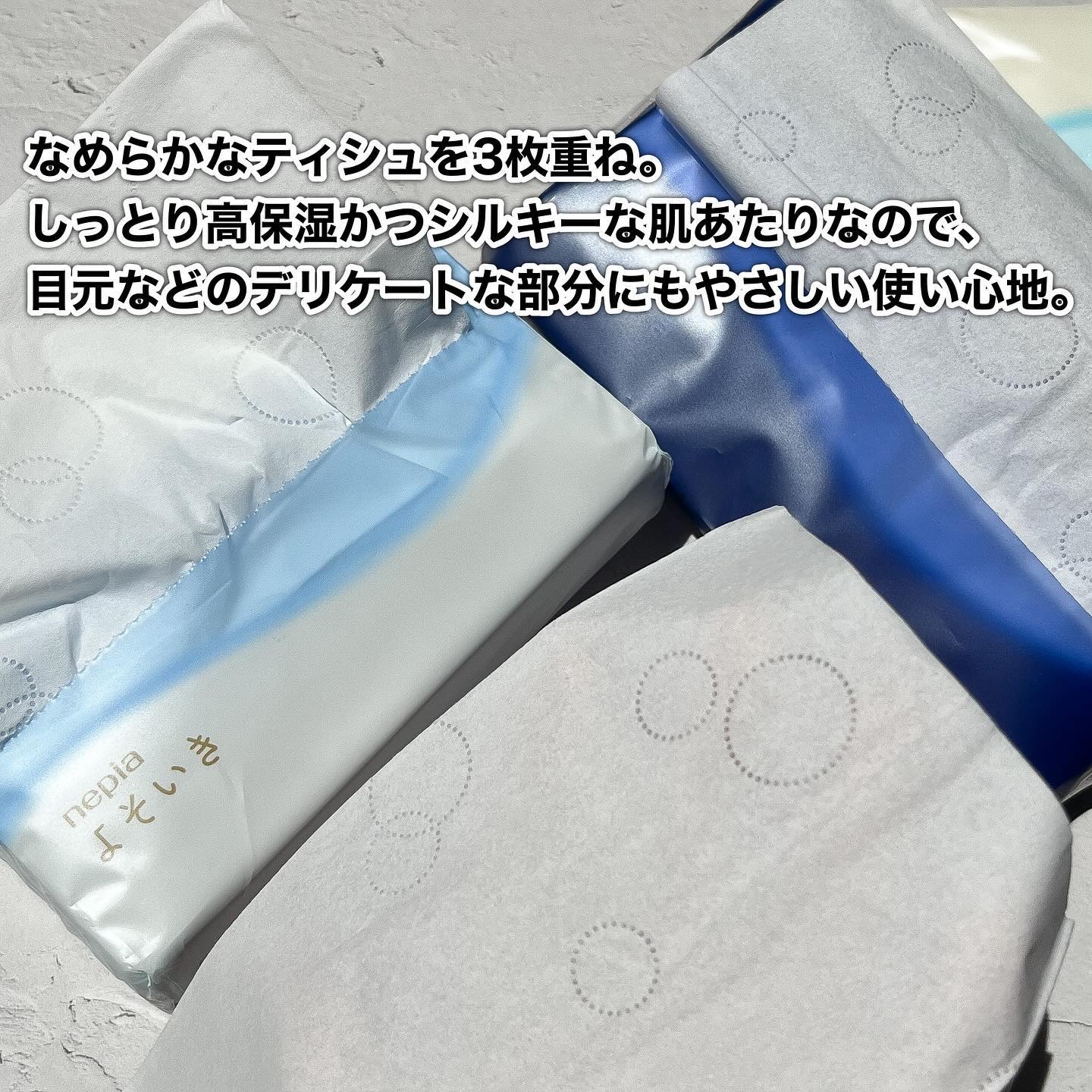 ものすごいラグジュアリーな見た目としっとした優しい触り心地がメイク直しの時間もご褒美時間にしてくれます♪ ネピアの高品質なティシュは3枚重ねだからこの季節、汗を拭いても破れにくいしメイク直し前の皮脂のティシュオフも大判サイズでとっても使いやすい! 肌に当てた瞬間の柔らかくてしっとりした感じが普段のポケットティッシュとは段違い!