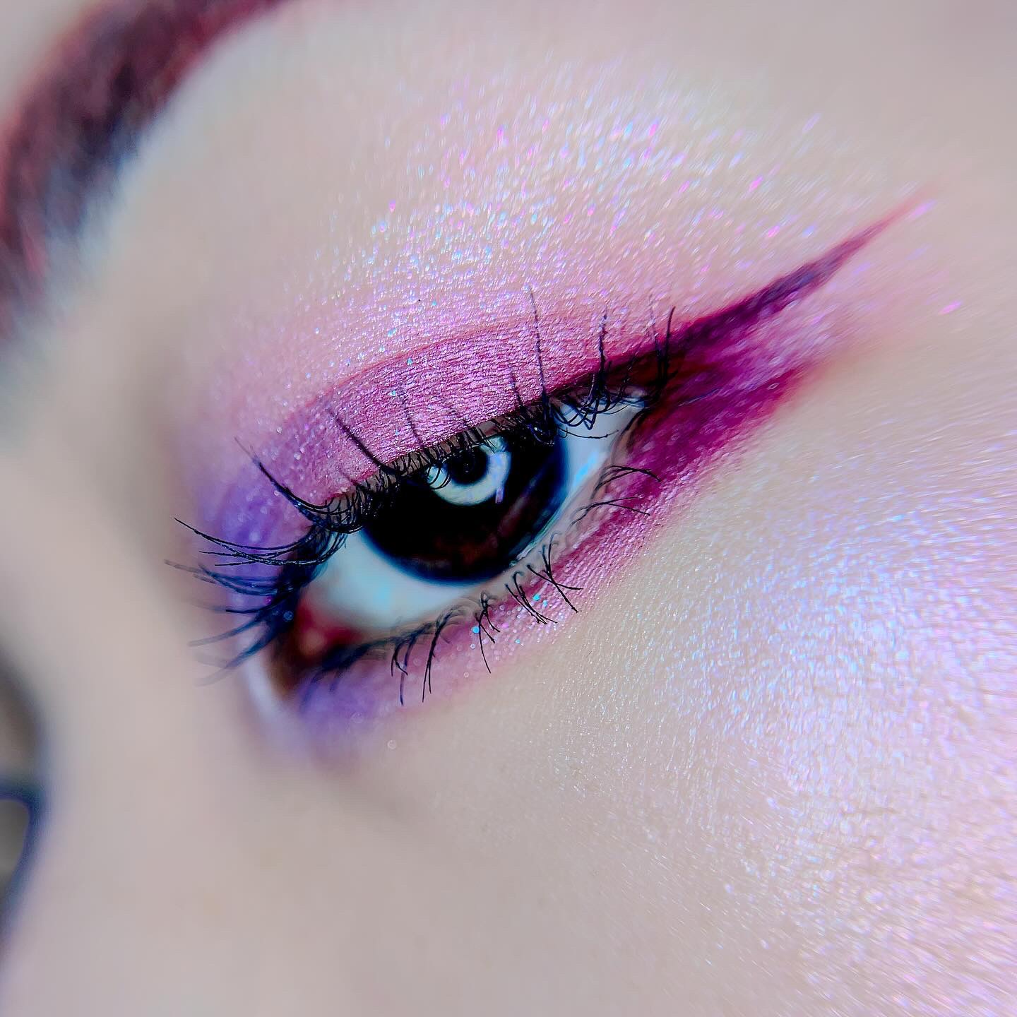 ベースに右上、目頭から黒目上に真ん中、黒目〜目尻に右下を、左上を目頭にくの字に塗ってもらいました✨ ピンクサクラよりもクールな感じで、目で見た色より私の肌では紫っぽく発色しました😍 上2つはラメはぎっしりでときめく💓 ブラウンメイクがとても苦手だけれどこれならブラウンメイク出来そう👌(かなり紫寄りですが) くすみ感は強いので苦手な方は厳しいかも…(特に真ん中) クールな印象になるので大人顔さん向けor大人顔になりたい方向けのイメージです✨