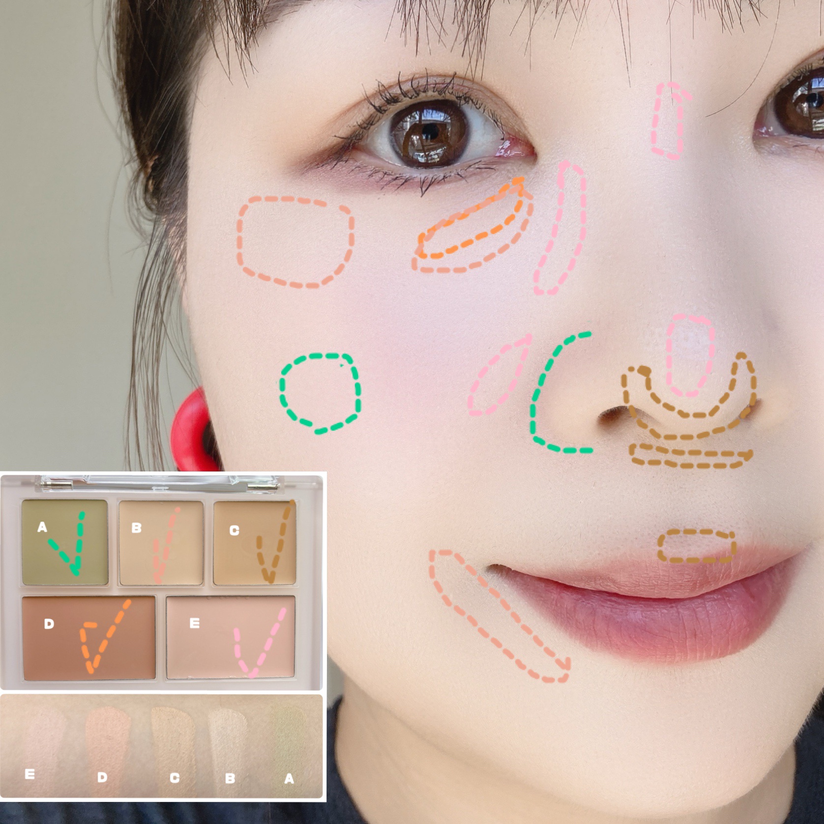 一つのパレットでカバーからカラーコントロールまでできちゃうコンシーラーパレット! 色んな肌悩みにアプローチする5色のカラーで、グリーン▶️くすみ、ニキビ跡とかの赤みカバー 密着力が高いコンシーラーで、よれにくかったよ!