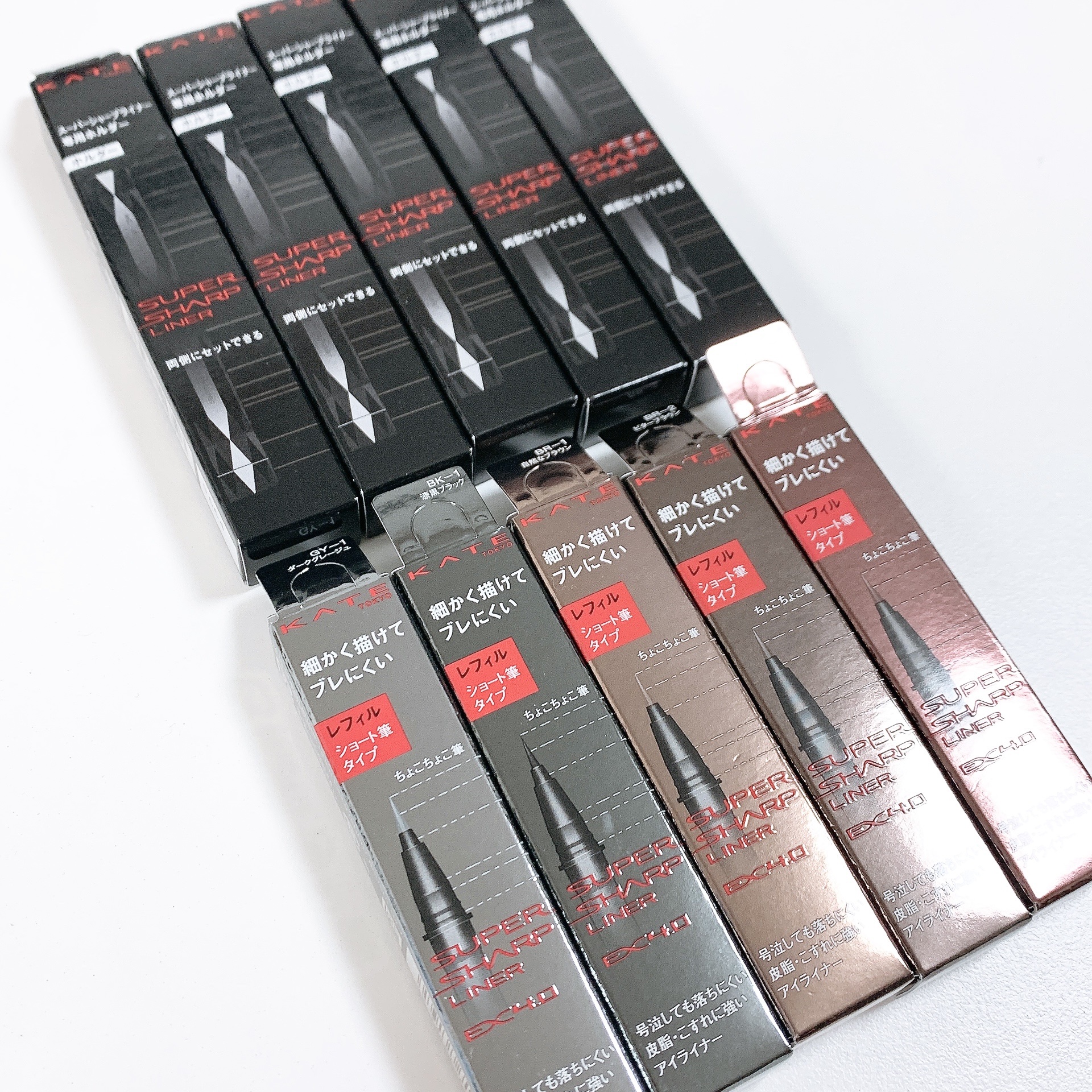 - 強い筆圧でも、どこを持っても極細ラインがブレずに描け、色が長時間持続するリキッドライナー。 ●極細ラインを安定して描けるケイト独自開発筆。 ●どこを持っても指先がフィットするダイヤモンドカット形状の容器。 ●汗・水に強く、号泣しても落ちにくいウォータープルーフタイプ。 ●皮脂・こすれに強い、スマッジプルーフタイプ。 ●ケイト スーパーシャープライナーEX4.0(レフィル)をセット可能です。 ●改良ポイント 極細ラインが安定して描き続けられる独自開発の筆 落ちにくさアップ 付け替えできる新容器「リ・ウェアボトル」 専用レフィルを付け替えて何度も繰り返し使える! 好きな色を組み合わせられるWエンド使用も! ※ケイト スーパーシャープライナーEX3.0と比較して <ショート筆 レフィル> 超極細ラインがちょこちょこ描けて失敗しにくい 毛先が短いショート筆タイプのリキッドライナーレフィル。号泣しても落ちにくく、皮脂・こすれに強い。 ●お湯オフタイプ ●一日中色持続 ●ケイト スーパーシャープライナーEX4.0のホルダー本体部、またはスーパーシャープライナー用ホルダーにセットして使う付け替えタイプです。筆先ごと付け替えられます。 ●全5色 BK-1(漆黒ブラック) BR-1(自然なブラウン) BR-2(ビターブラウン) BR-6(ダークブラウン) GY-1(ダークグレージュ)