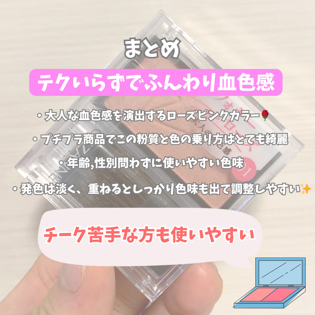 粉質がよく、ふんわり自然に発色! しっとりしていて、浮くことなく肌になじみます☺️ ツヤ感もほどよく、本当に内側から血色感が滲み出たようなほっぺたに✨ この質で550円は凄いですセザンヌさん🥹👏