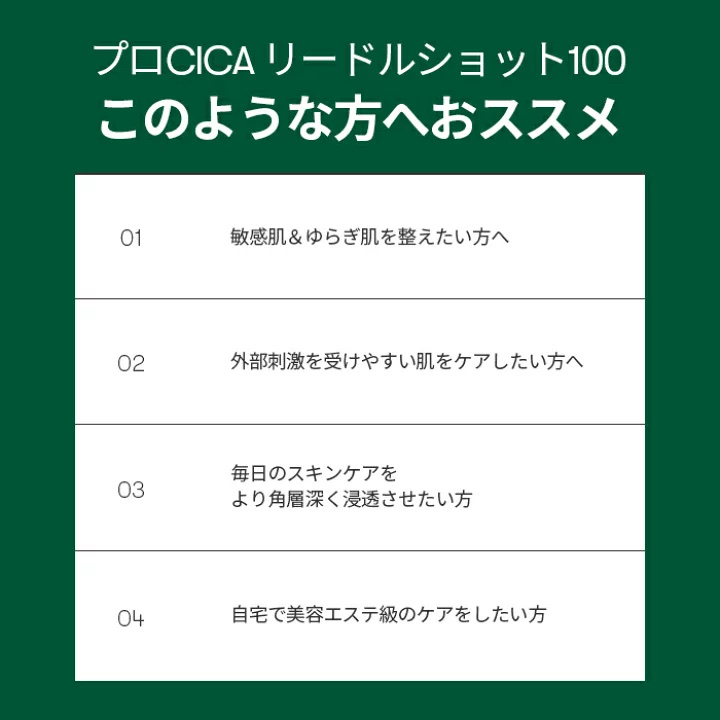 元々リードルショット300を使っていて効果は感じるけど痛みが強かったためメガ割の際にこちらを購入しました! しばらく使用してみたところ、300と比較してあきらかに痛みが少なくデイリー使いしやすい!なおかつ効果もあったので良かったです☺︎☺︎ 肌のゆらぎが気になったときに使用しているのでプロCICAの効果にも期待💭