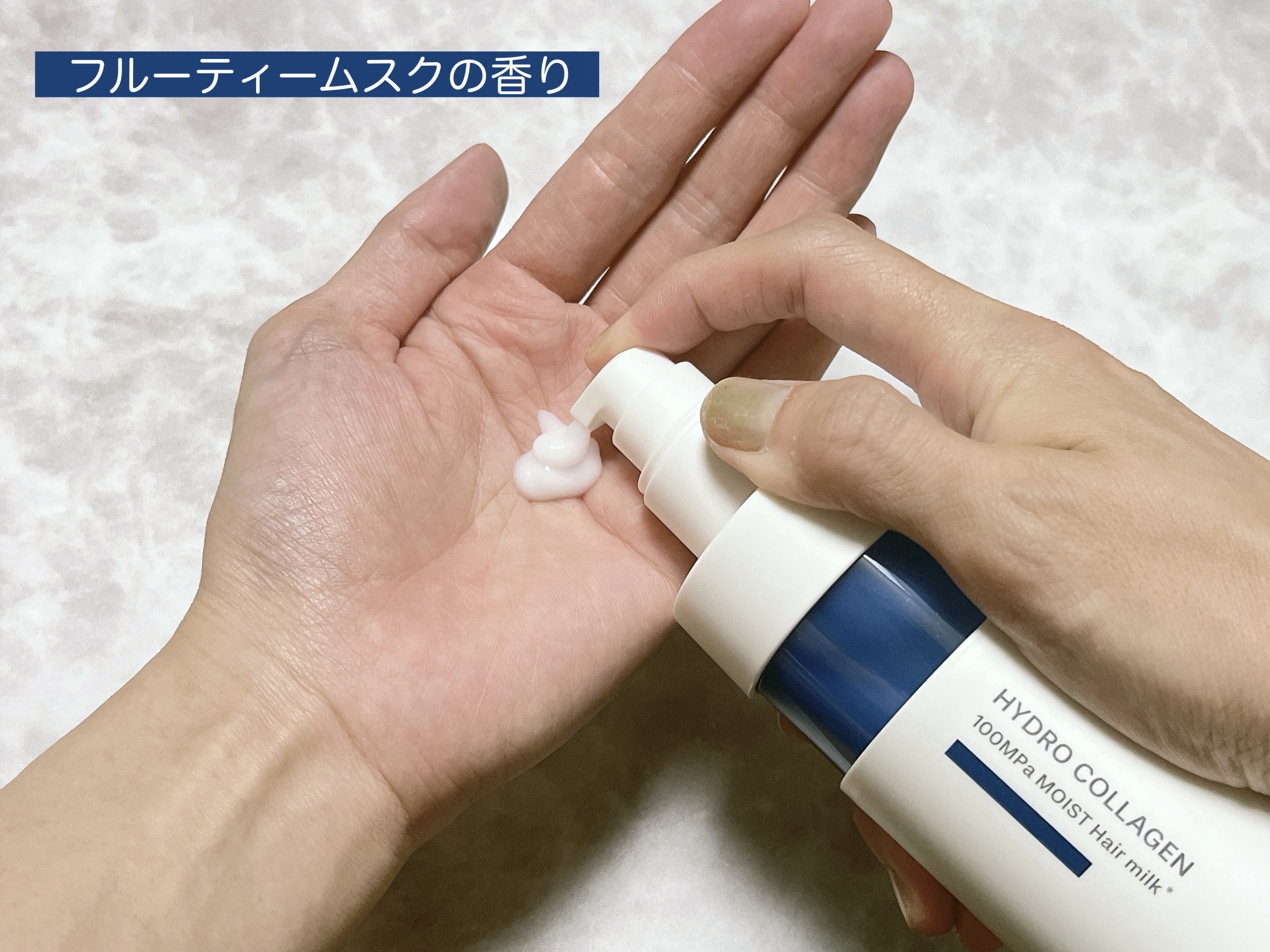 パサつき、アホ毛、絡まりにアプローチ。 超高圧浸透型ハイドロコラーゲン配合の集中美容液へアミルク。 しっとりぷるんとしたまとまった髪になります。『Vミルク』は艶サラ系、『COモイスト』はしっとりぷるん系で、どちらも広がりが抑えられ、まとまり良く仕上がりました。 香りは『フルーティームスク』 フルーティーさとムスクの柔らかい香りですが、ほのかに香るので香水とケンカする事もなく使いやすいです。