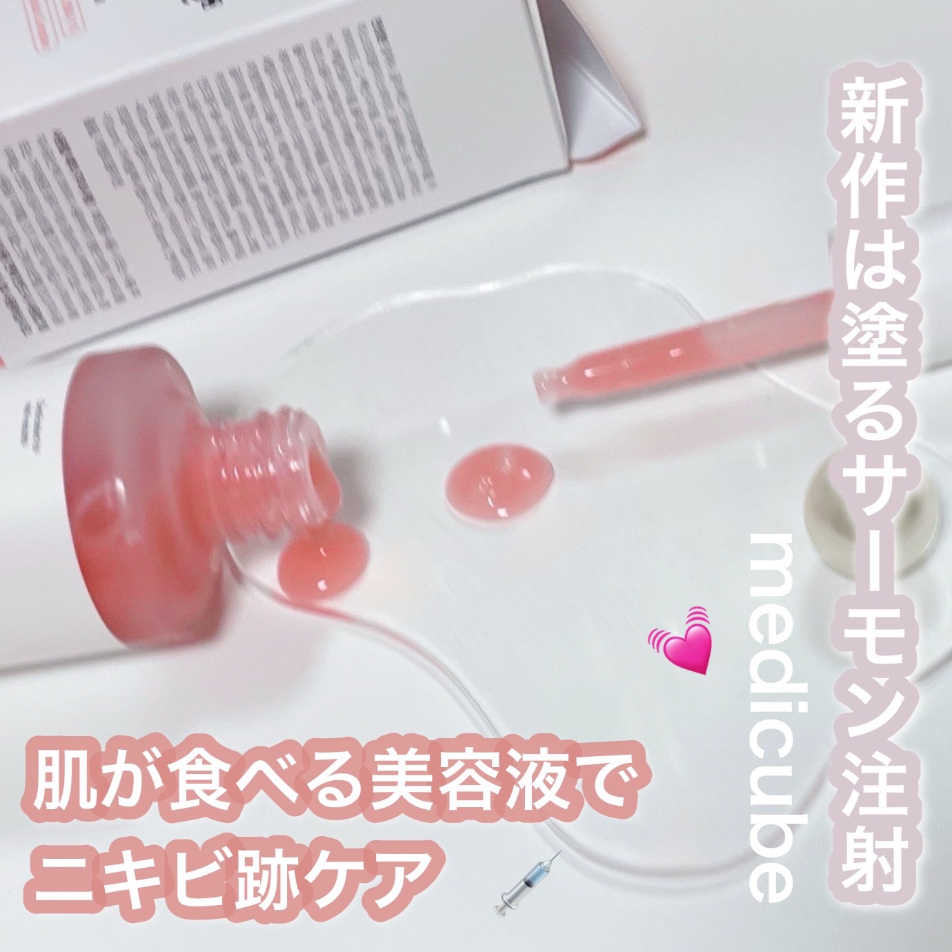 とろみのあるテクスチャー なめらかに肌に馴染んでくれてベタつきはあまり感じませんでした 使い切る頃には虜になって今回のメガ割で3個も購入してしまったくらい好き 肌の組織に類似したサーモンDNA成分配合のサーモンPDRNでお肌のハリ弾力、ニキビ跡などの色素沈着にアプローチしてくれるそうです