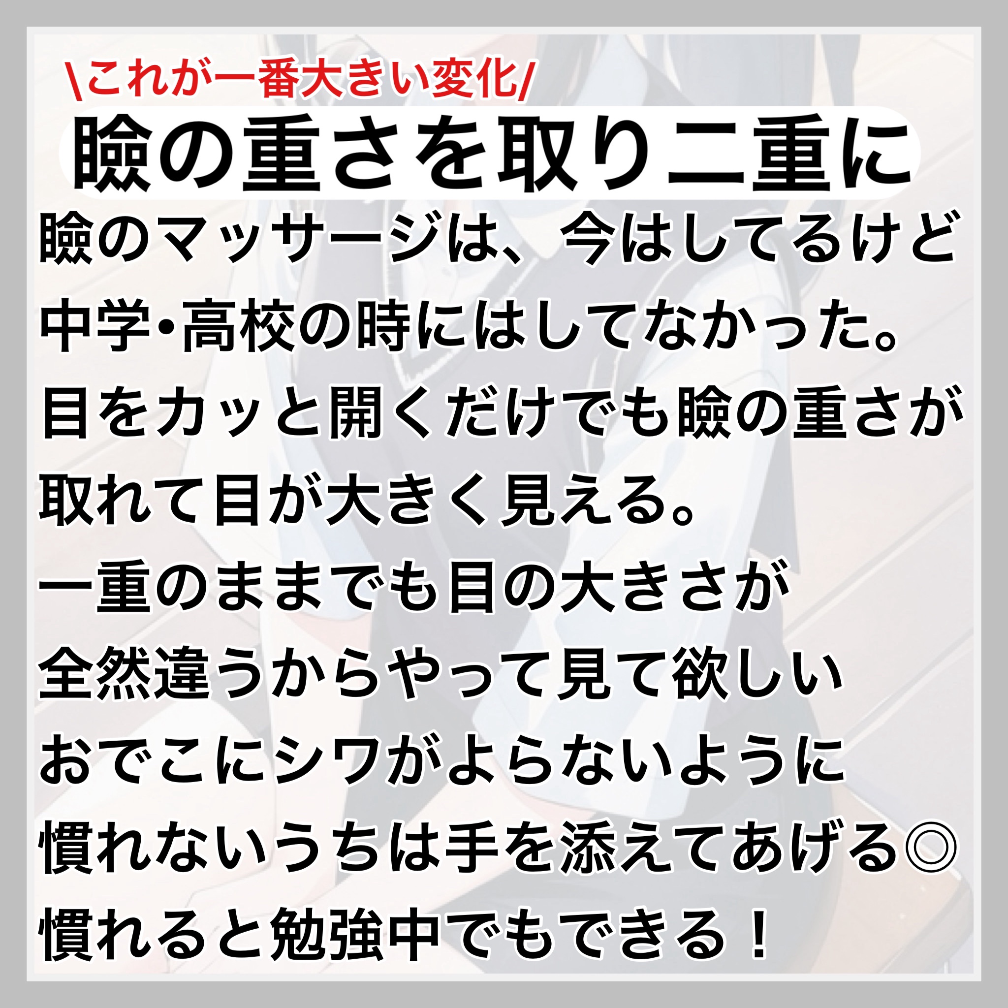 瞼の重さをとるのは絶対必要! 目をカッと開くだけを続けても目が大きくなるしっかり目が開くようになる!! 勉強しながらでもできることがたくさんあるから取り入れて見て欲しい。YouTube見ながらでもできる 大学入ってから時間ができるから、そこから頑張るのもいいけど、大学入る前から頑張る方が絶対いい!!