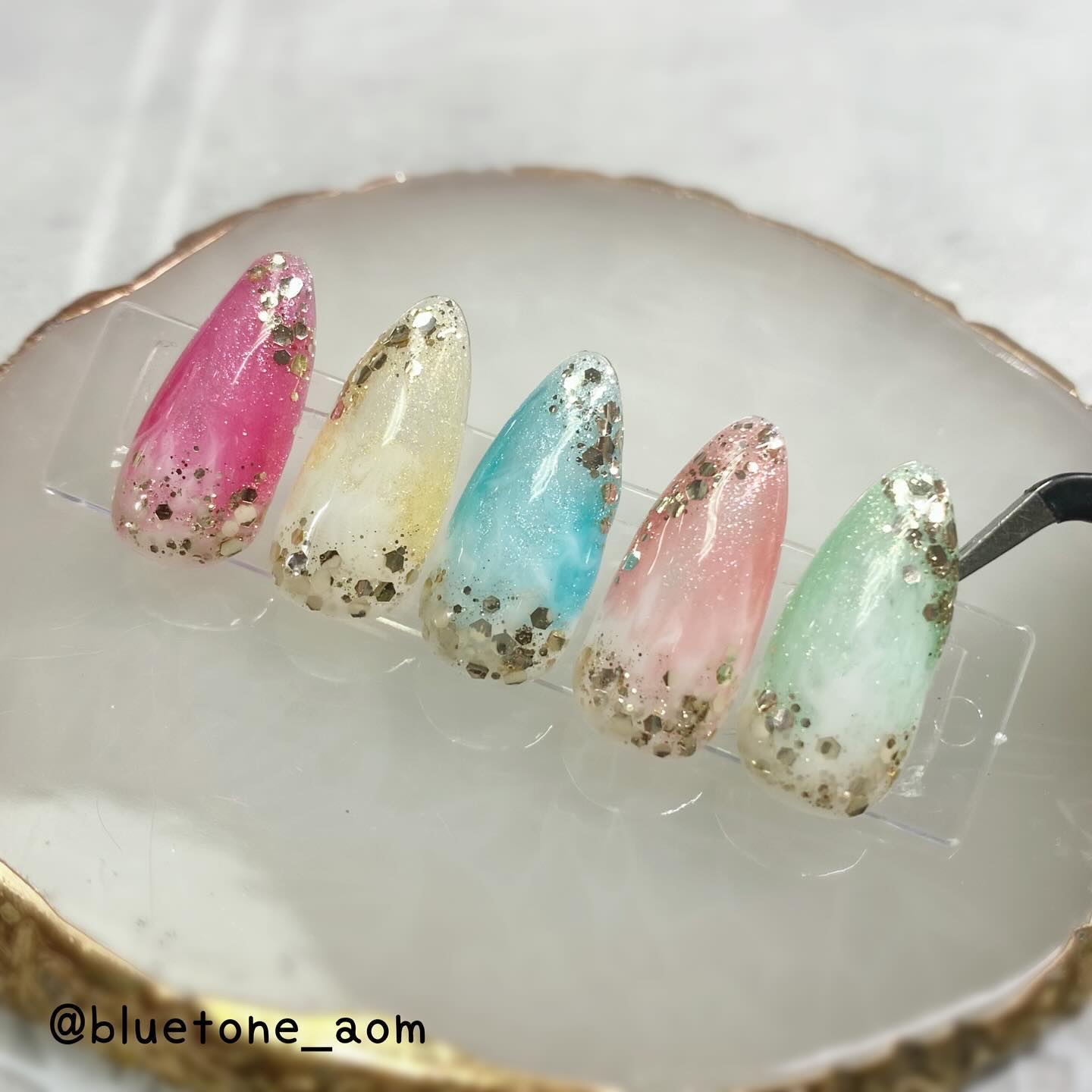 ラメがしっかりしてるし クリアカラーが入ってるから オーロラパウダー無しでも 充分キラキラしました! 反射強めのフィルムなので 実物はもっと うるうるとキラキラが強いです! ビー玉みたい🥺 ネイルシール長持ちさせたいけど ちょっと飽きてきたな〜って時とかに 全然違った印象になるのでオススメです! Seriaのベースジェル 本当にうるうるネイルしやすいので オススメしたい🙆♀️