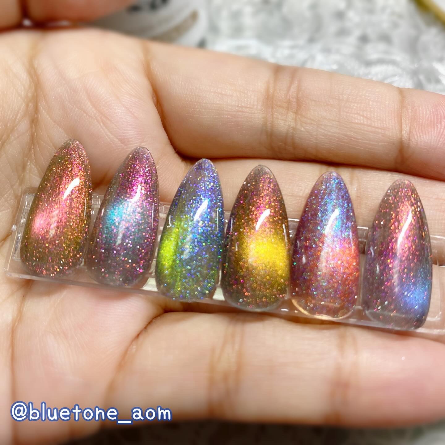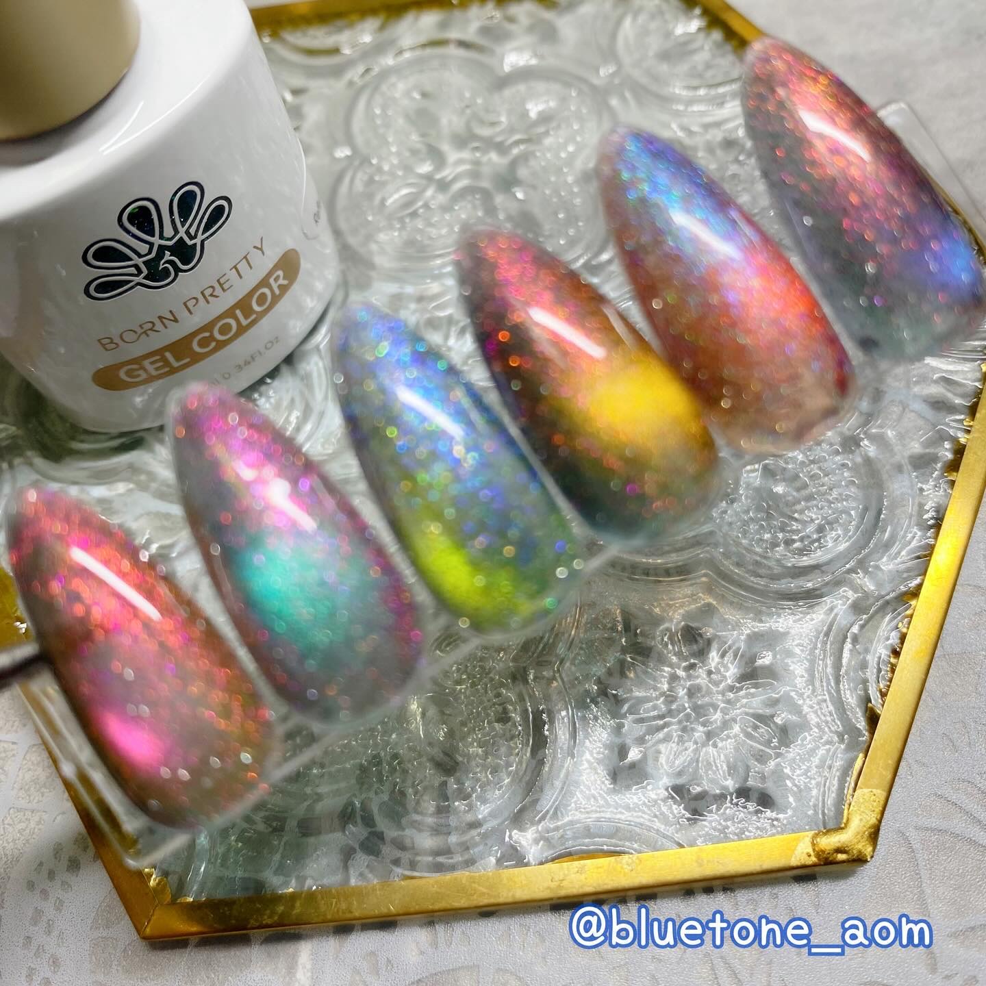 ラメがしっかりしてるし クリアカラーが入ってるから オーロラパウダー無しでも 充分キラキラしました! 反射強めのフィルムなので 実物はもっと うるうるとキラキラが強いです! ビー玉みたい🥺 ネイルシール長持ちさせたいけど ちょっと飽きてきたな〜って時とかに 全然違った印象になるのでオススメです! Seriaのベースジェル 本当にうるうるネイルしやすいので オススメしたい🙆♀️