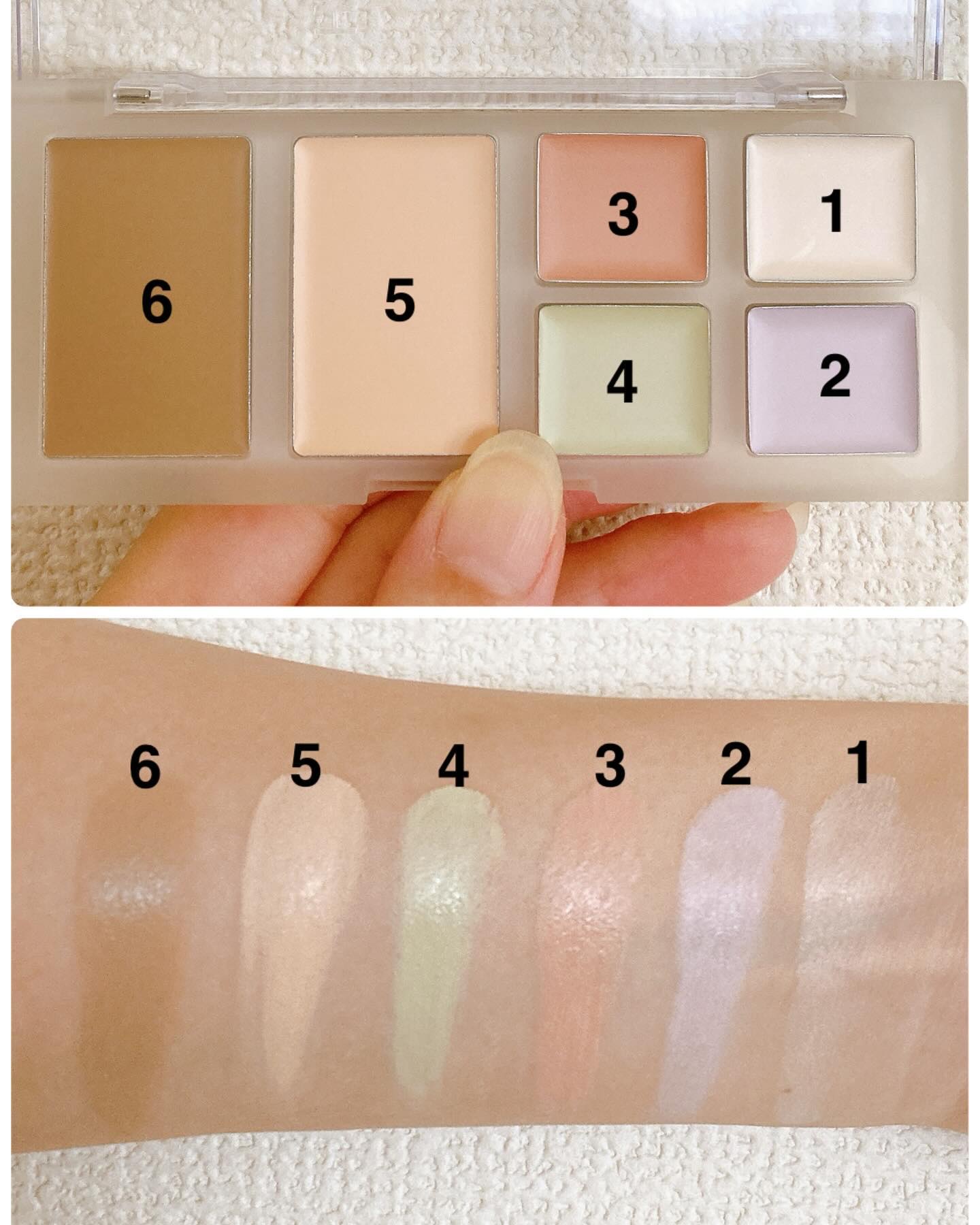 - 6色のカラーが入った、コンシーラーパレットで、コンシーラーとしてだけでなく、シェーディング、ハイライト、トーン調整が可能です。 ピーチ: クマカバーにおすすめ。保湿力が高く、ナチュラルなツヤ感です。 グリーン:ニキビや赤みのカバーにおすすめ。滑らかなテクスチャーで、カバー力が高いです。 パープル: くすみカバーにおすすめ。保湿力が高く、ナチュラルなツヤ感です。 ハイライト: 光の屈折を利用し、自然で柔らかい輝きを与えます。 シェーディング: 自然に影を演出し、しっかりと密着します。 コンシーラー: 滑らかなテクスチャーで、カバー力が高いです。