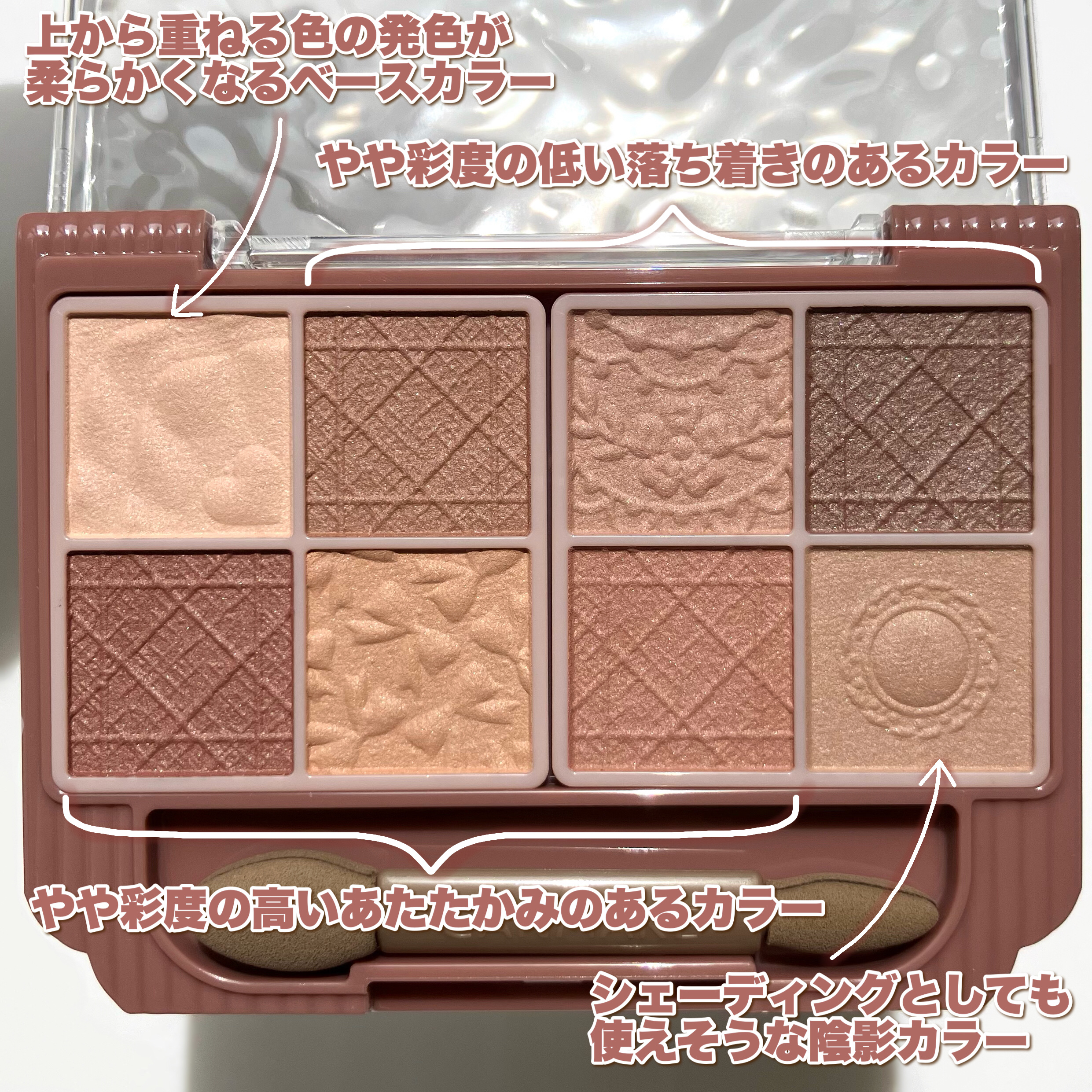 - いつでも一緒♡多色なのに持ち歩ける! 8色入りアイシャドウパレットのマットタイプ♪ 多色パレットでありながら、「持ち歩けること」と「外出先でもメイク直しができること」にこだわったアイシャドウパレット。 ダブルエンドチップ付です♪ マットが大好きな方にも、少し苦手意識がある方にも手に取っていただきたく全色マットor1色ラメ入りの構成にしています♪ (M01:全色マット、M02・M03:1色ラメ入り) 全体は同系色で統一しており、全色使いやすいパレット。 色の組み合わせは自由に♡自分好みのメイクを楽しめます! 【マット】 隠ぺい感とふわっと感を両立させた質感♪ なめらかで重ねても粉っぽくなりにくく、厚塗り感のない仕上がり。 伸びが良いのでムラになりにくく、しっとりフィットして仕上がりを長時間キープ✨ 【ラメ】 ラメ・パールだけがのる透明感のある仕上がり。 高輝度なガラスパール配合で、高見えする輝き✨ なめらかで粉っぽくならず、しっとり密着して仕上がりを長時間キープ! サラサラしたマットシャドウにもラメがしっかり密着する処方を追求しました♪ 蓋にはマット感を表現したすりガラス風のグラデーションデザインが、パウダー部分にはリボンやレース・ボタンの型押しが入っているなど、デザインにもこだわっています♡