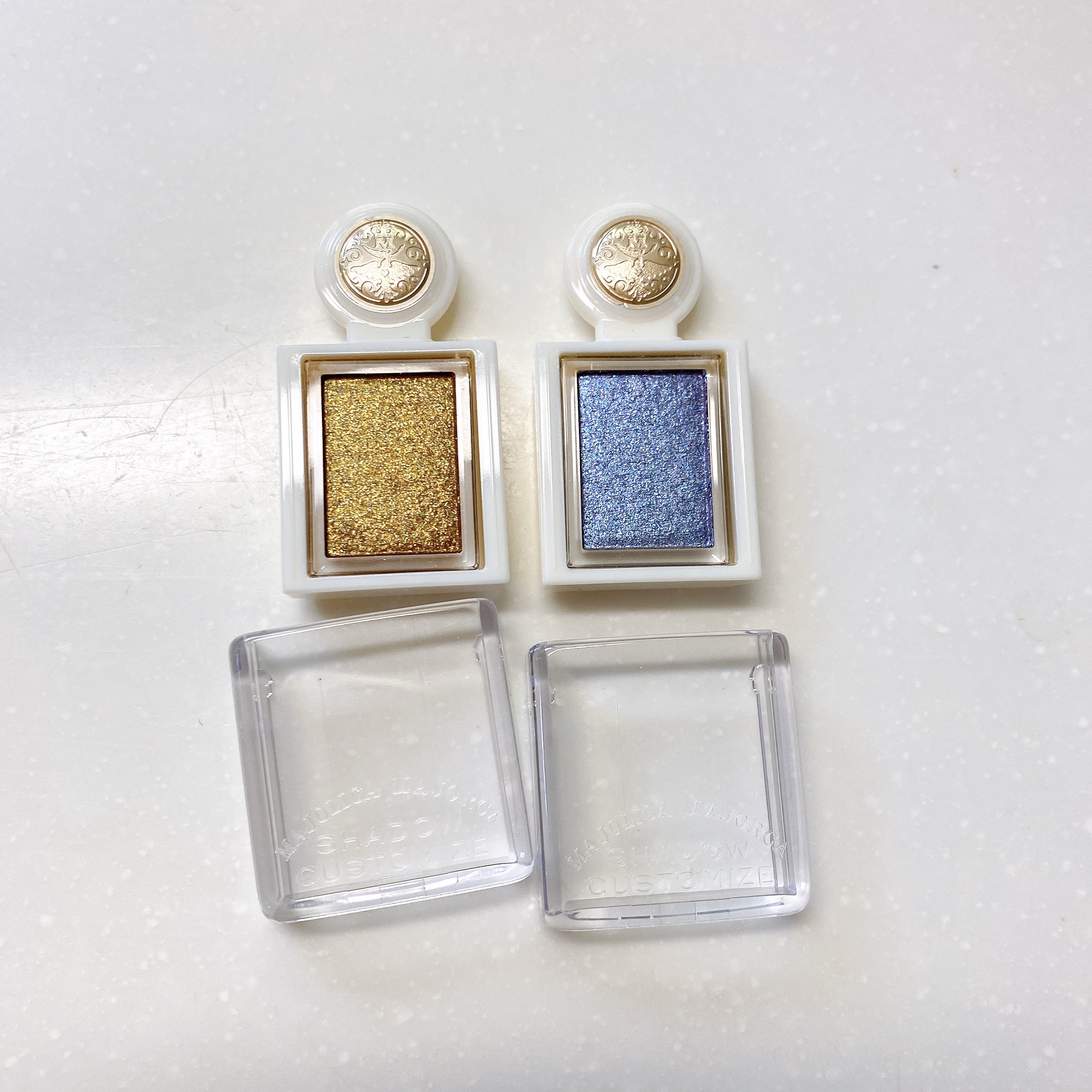 アンティークな発色の金色が可愛すぎる…!!!! 月の欠片を砕いて詰めたおとぎ話みたいなアイシャドウで儚くて切なくてあまりにも好き🌕 繊細なラメ感でぷにさらな質感。ブルーも可愛いけどゴールドもやっぱり可愛い߹ᯅ߹